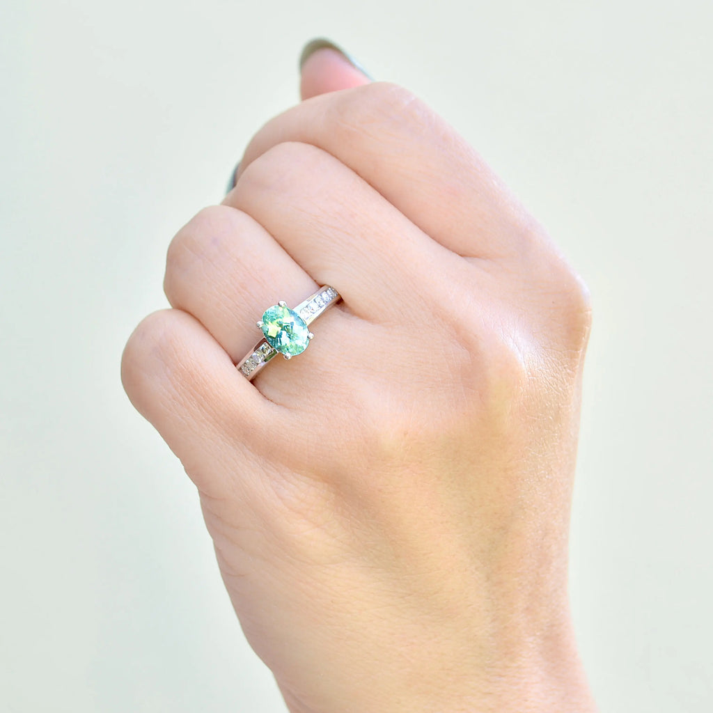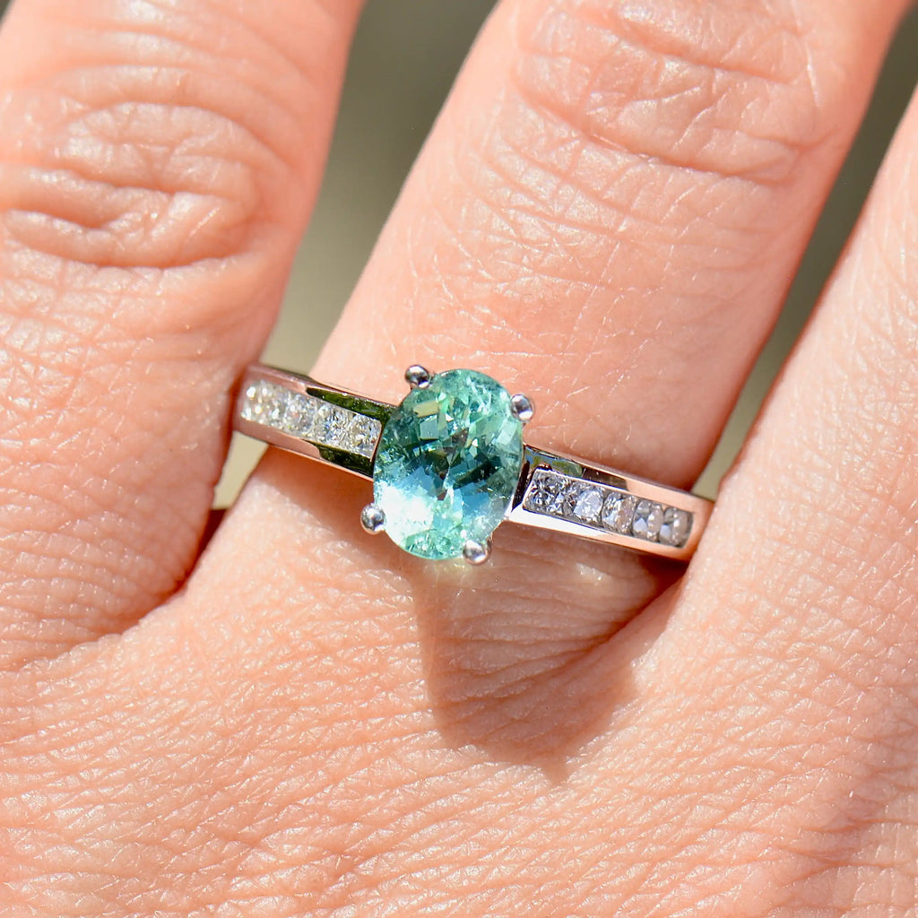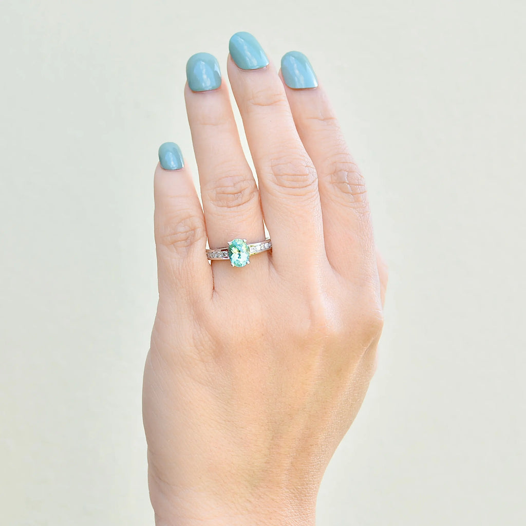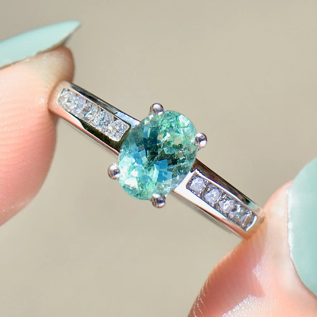 鮮やかなパライバトルマリンをあしらった、エレガントで印象的なリング。独特のブルーグリーンの色合いと比類なき輝きで知られています。オーバルカットのトルマリンは、磨き上げられた18金ホワイトゴールドに爪留めされており、光を自由に取り込み、石本来の輝きと遊色効果を際立たせます。