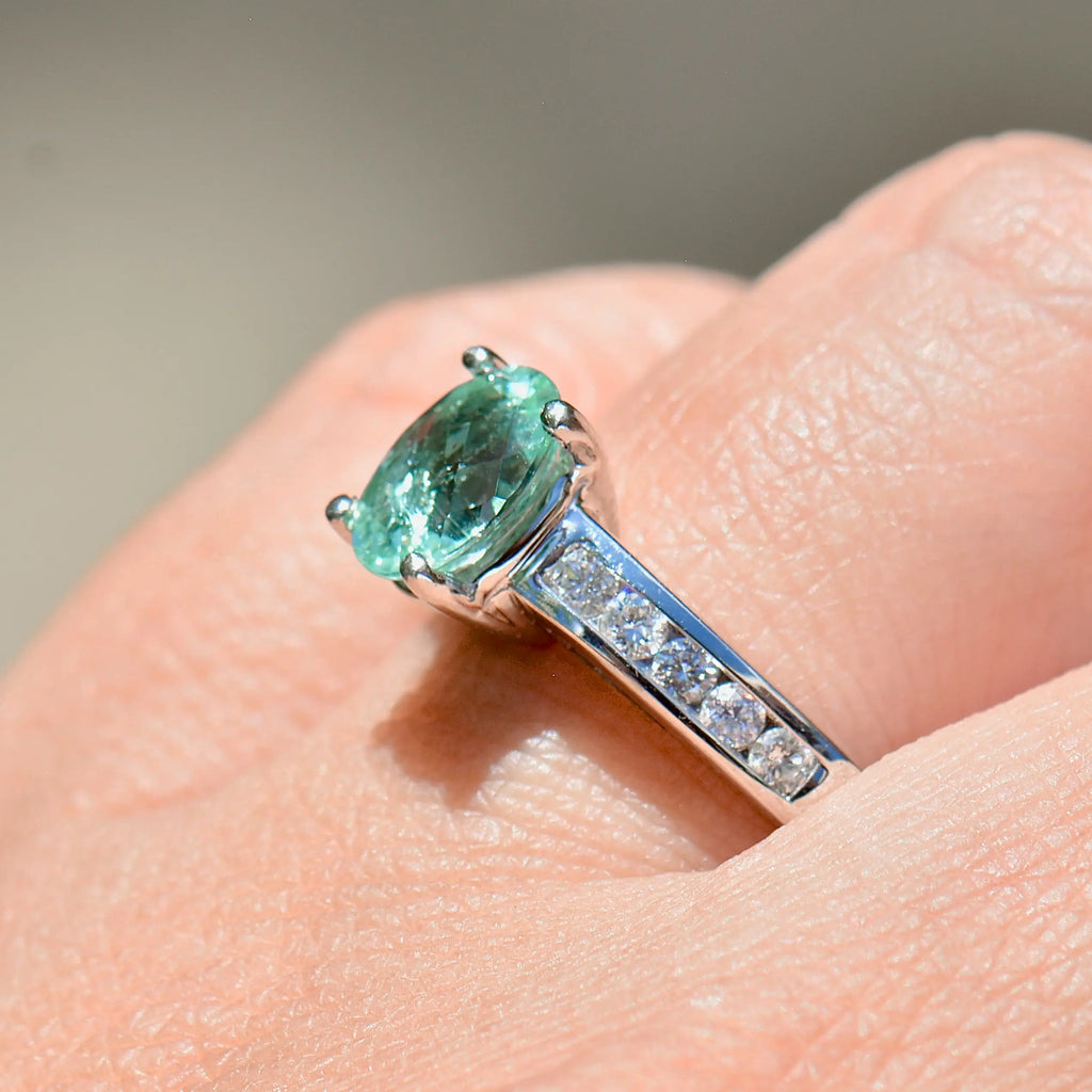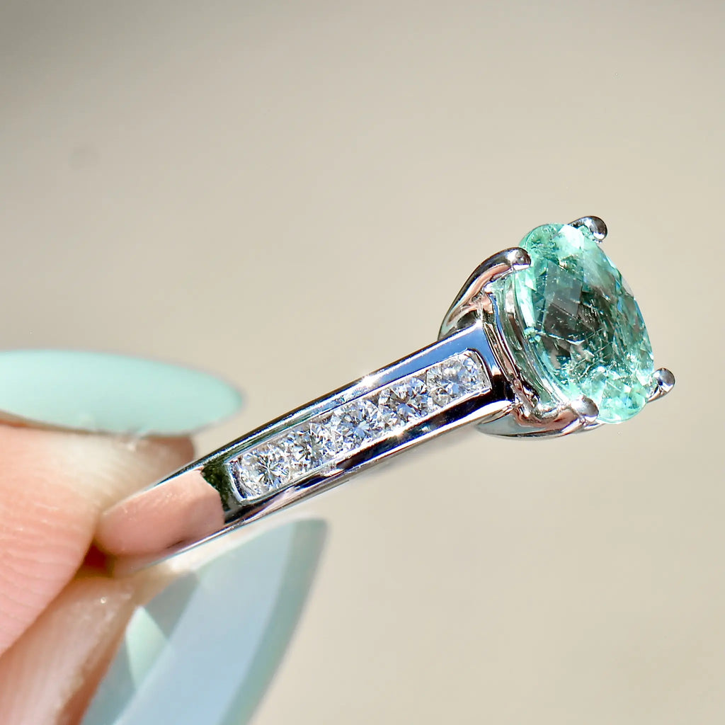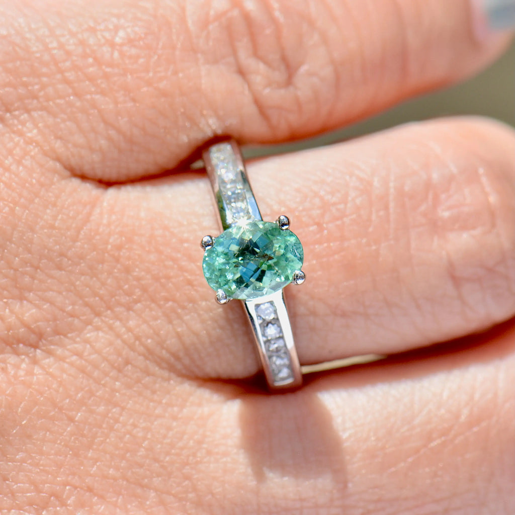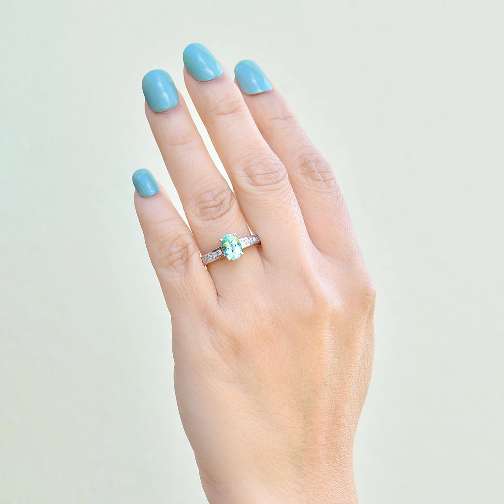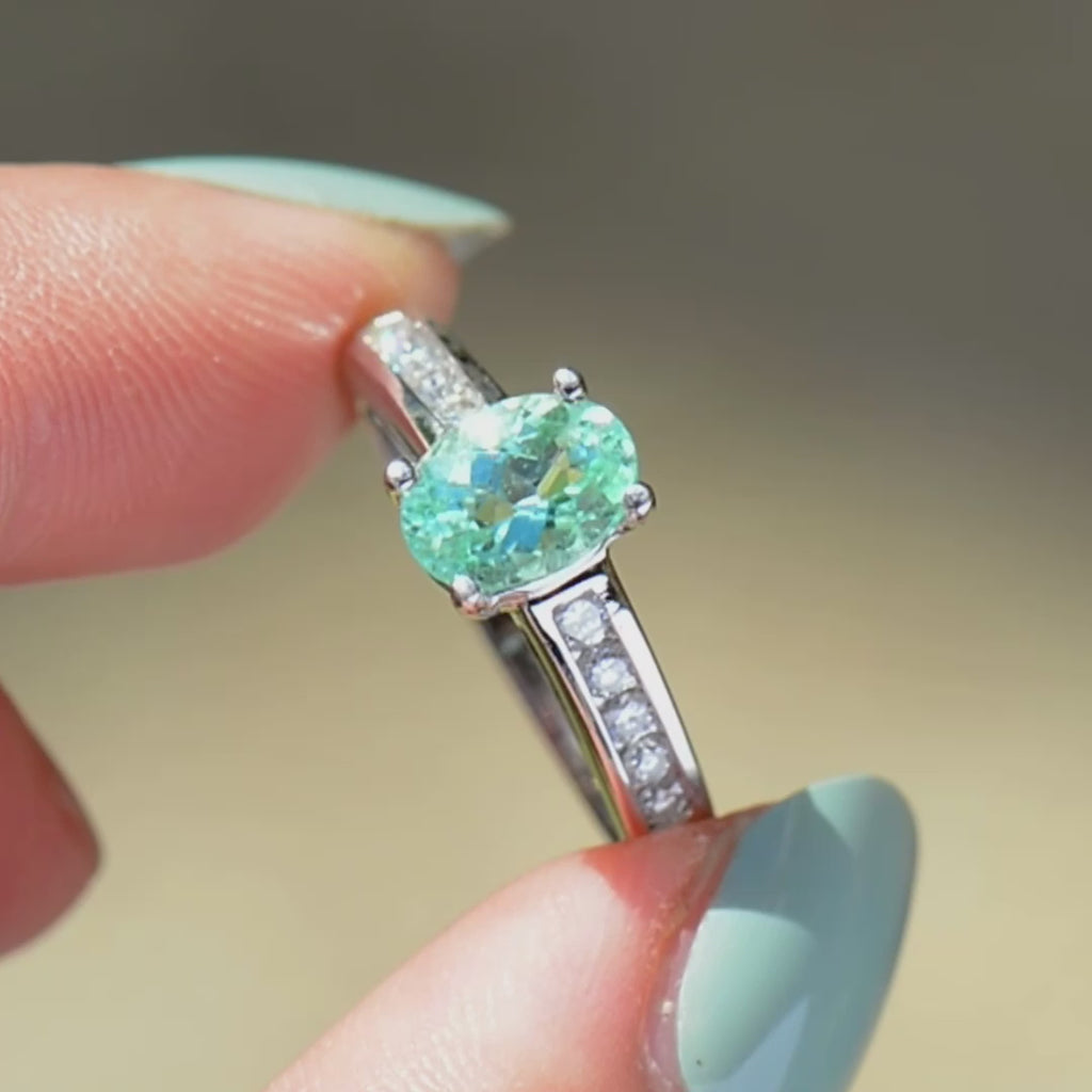鮮やかなパライバトルマリンをあしらった、エレガントで印象的なリング。独特のブルーグリーンの色合いと比類なき輝きで知られています。オーバルカットのトルマリンは、磨き上げられた18金ホワイトゴールドに爪留めされており、光を自由に取り込み、石本来の輝きと遊色効果を際立たせます。