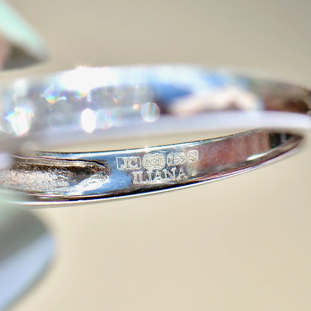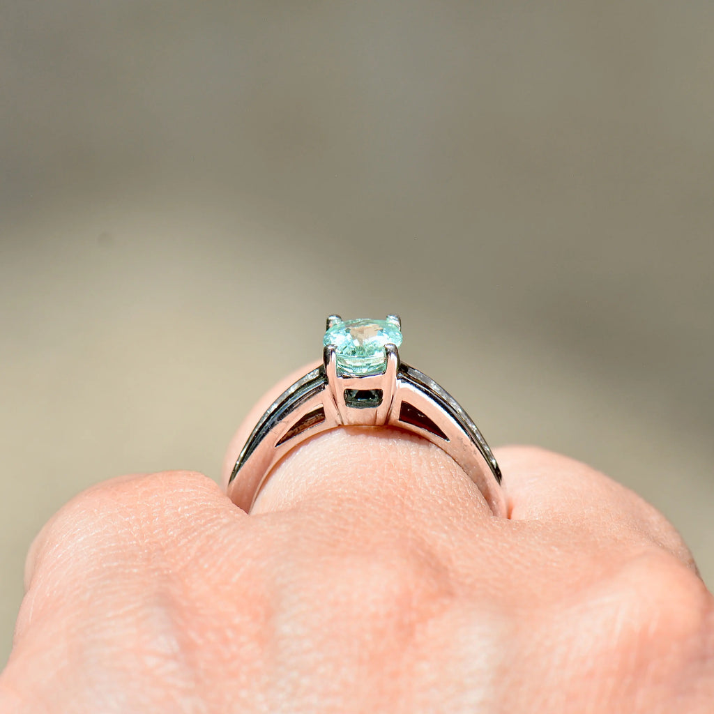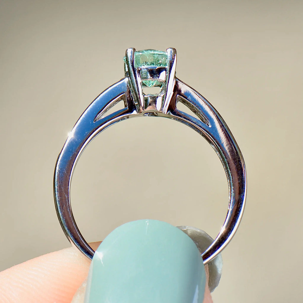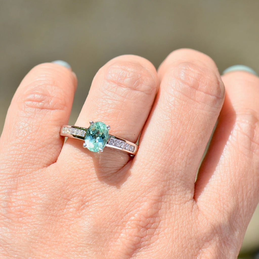 鮮やかなパライバトルマリンをあしらった、エレガントで印象的なリング。独特のブルーグリーンの色合いと比類なき輝きで知られています。オーバルカットのトルマリンは、磨き上げられた18金ホワイトゴールドに爪留めされており、光を自由に取り込み、石本来の輝きと遊色効果を際立たせます。