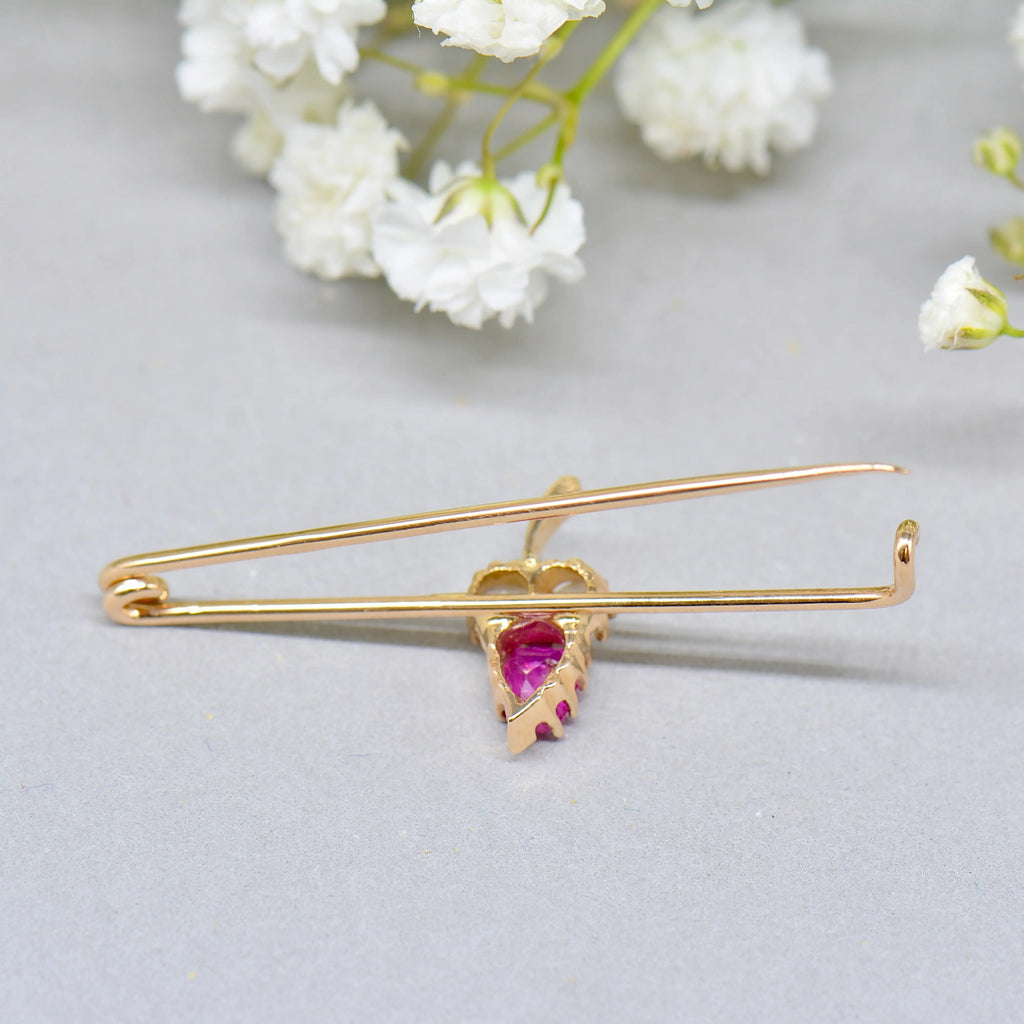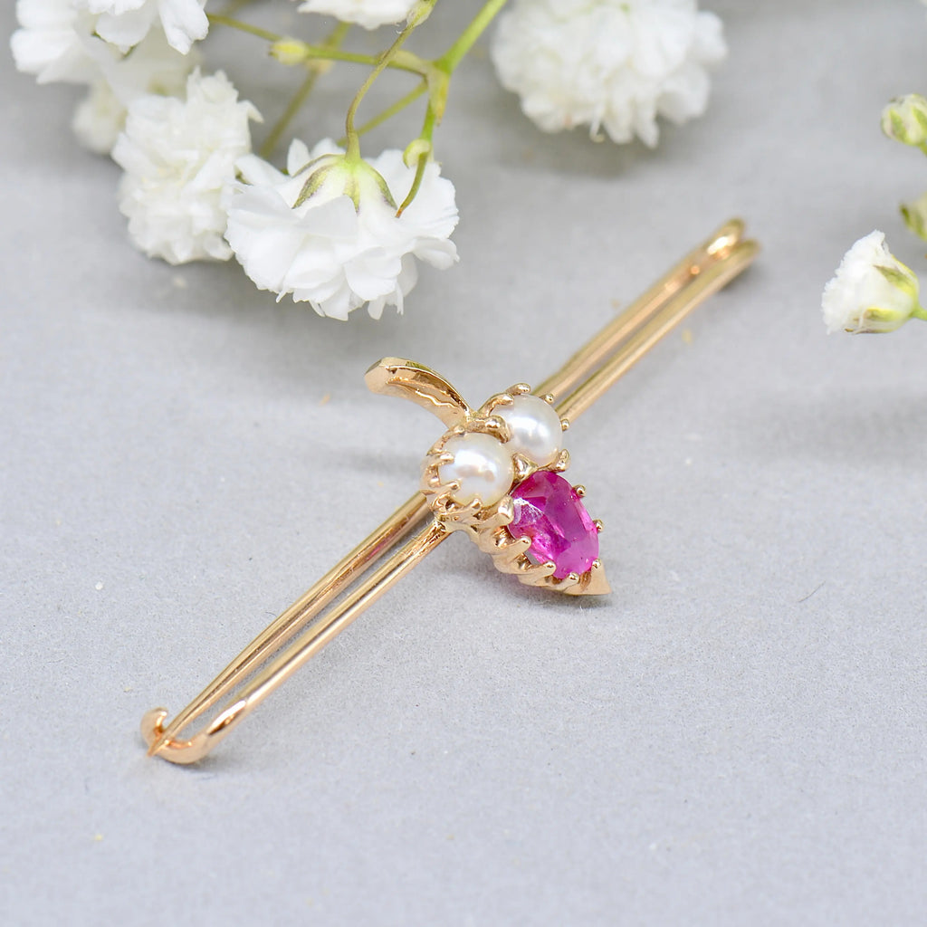 The ruby displays a bright pinkish-red hue with lovely inner fire, contrasted by the soft iridescence of the pearls. The slender 18ct gold bar provides a classic Victorian setting, allowing the gemstone cluster to stand out while keeping the piece refined and wearable.