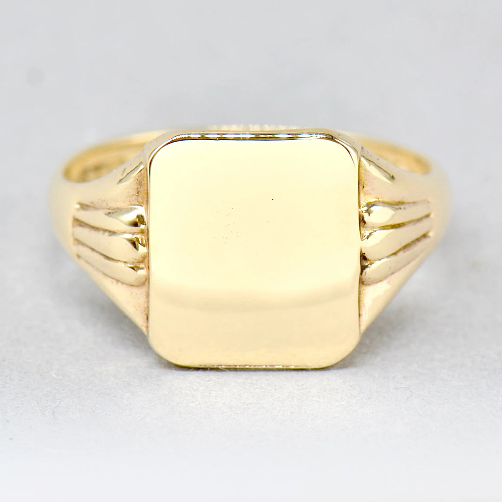 A classic 1960s signet ring crafted in solid 9ct yellow gold, featuring a smooth rectangular head with softly rounded corners, perfect as-is or ready for personal engraving. The stepped, fluted shoulders add a touch of mid-century character, giving the ring a strong and elegant profile.