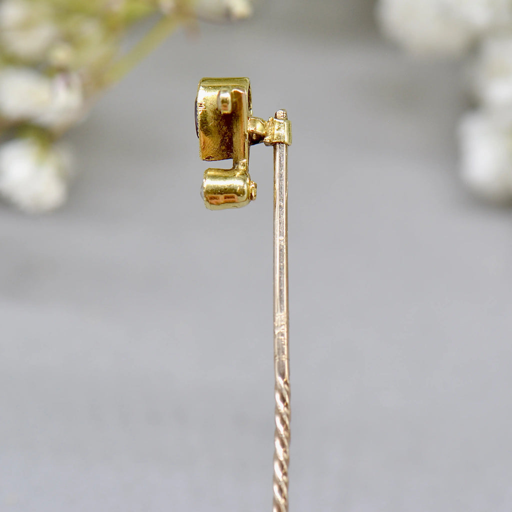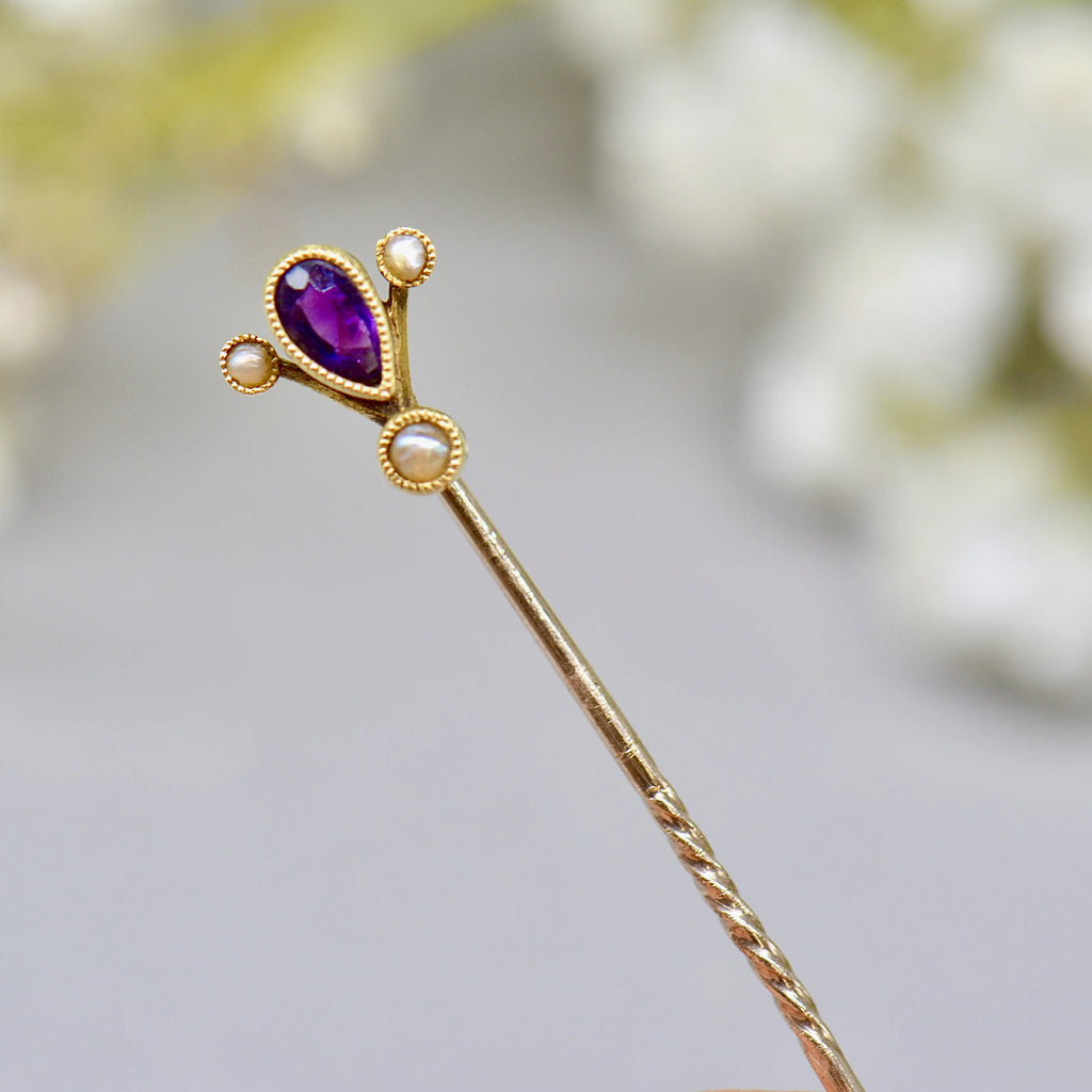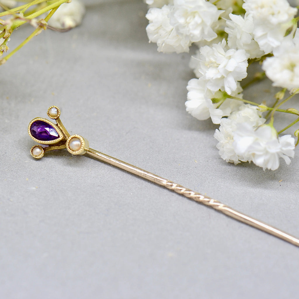 Set in 15ct yellow gold, the amethyst shows a deep violet hue with lively internal brightness, perfectly contrasted by the warm gold and the soft lustre of the pearls. The twisted 9ct gold pin stem adds strength and authenticity, making this piece ideal for a lapel, cravat, tie, or as a charming addition to any antique collection.