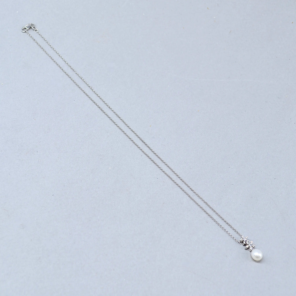 A beautifully crafted piece in cool 9ct white gold, this pendant features a delicate snowflake-inspired top set with ten sparkling diamonds, leading to a luminous white pearl suspended below. The combination of crisp white gold, bright diamond accents, and the soft glow of the pearl creates a refined, wintry elegance perfect for both everyday wear and special occasions.
