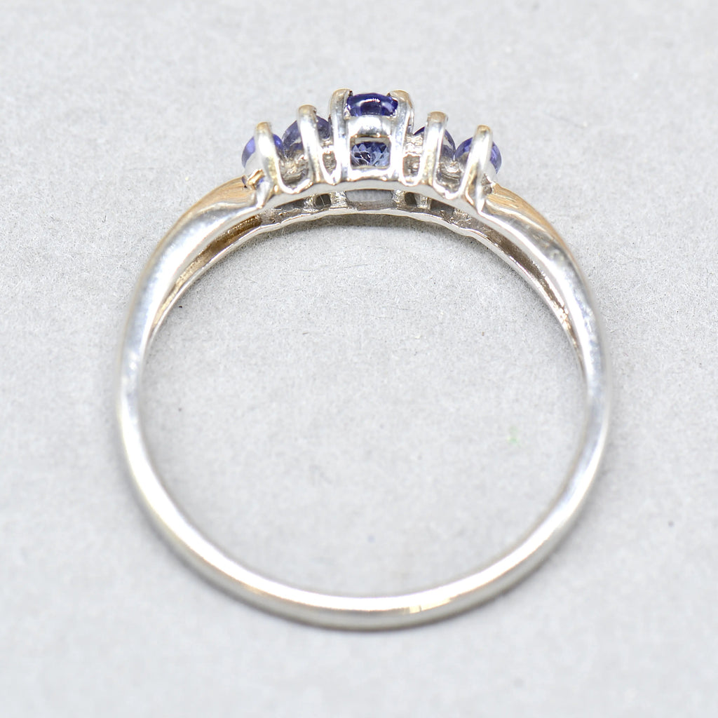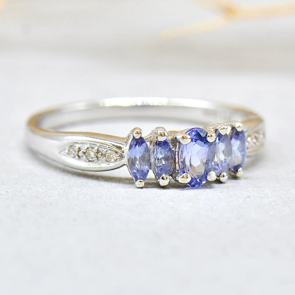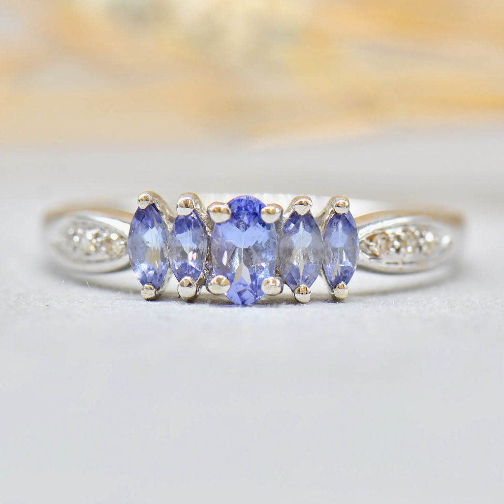 This graceful five-stone ring showcases a beautiful arrangement of natural tanzanites and diamonds in a refined 9ct white gold setting.