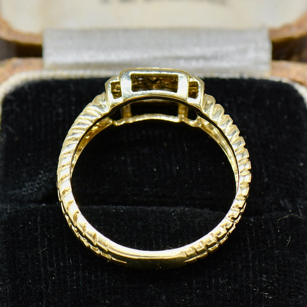 This stylish vintage ring combines timeless elegance with a subtle contemporary edge, crafted in warm 9ct yellow gold with a distinctive chain link–inspired band. Five natural diamonds are flush-set across the top, adding a refined sparkle that catches the light beautifully.