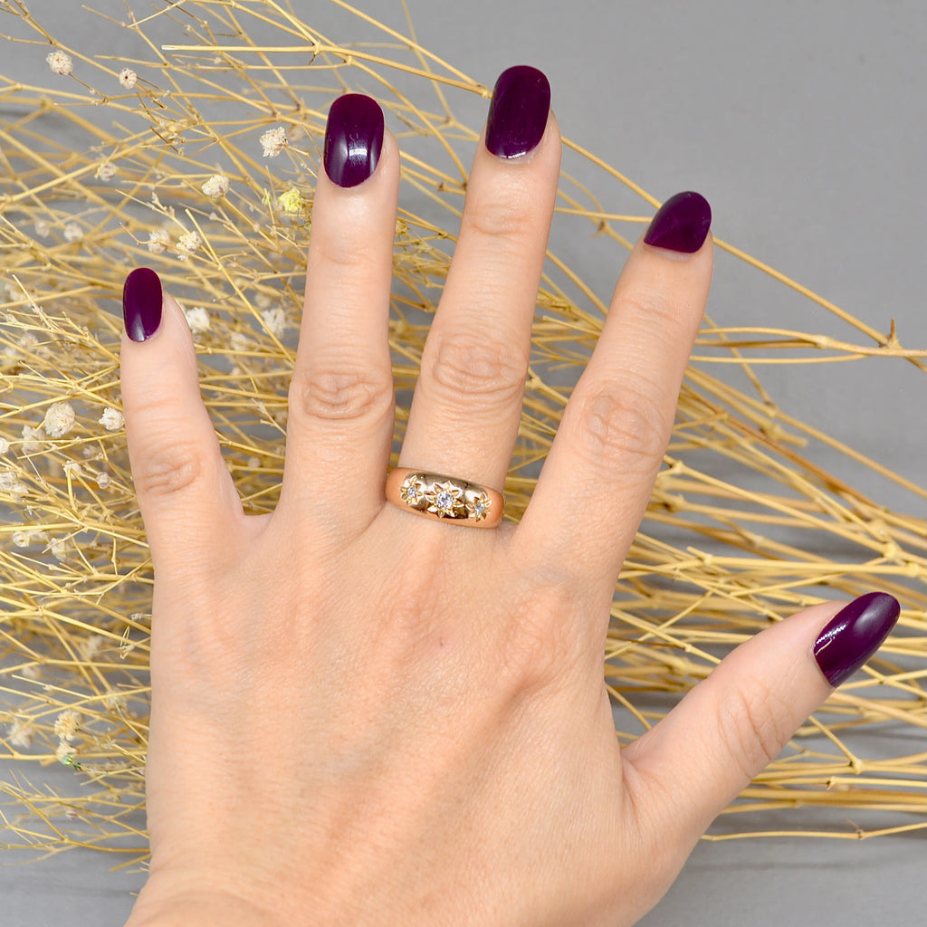 The central diamond, weighing approximately 0.09ct, is framed by two smaller stones of around 0.03ct each, giving a combined total of approximately 0.15 carats. The gold band has a comfortable low profile with softly rounded edges, perfect for everyday wear while retaining its classic antique character.