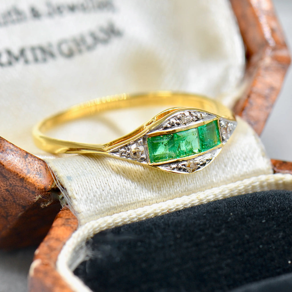 The ring is set with three square-cut natural emeralds, arranged in a neat horizontal row and displaying a vivid, fresh green hue. These are framed and accented by four round-cut natural diamonds, set into platinum shoulders that taper elegantly towards the centre, creating a balanced, geometric silhouette typical of Art Deco design.