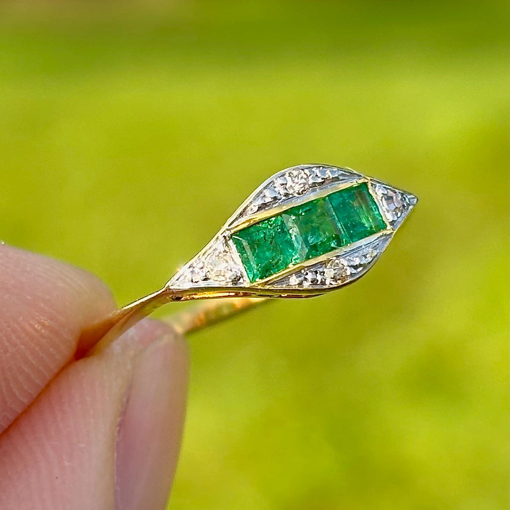 A striking Art Deco emerald and diamond ring, crafted in 18ct yellow gold with a contrasting platinum-topped setting, a classic construction of the era used to enhance the brilliance of diamonds while retaining the warmth of yellow gold.