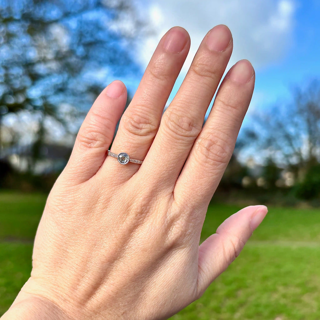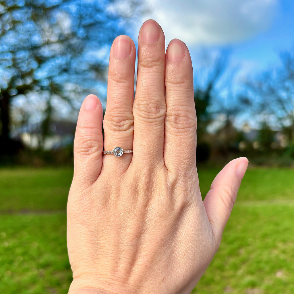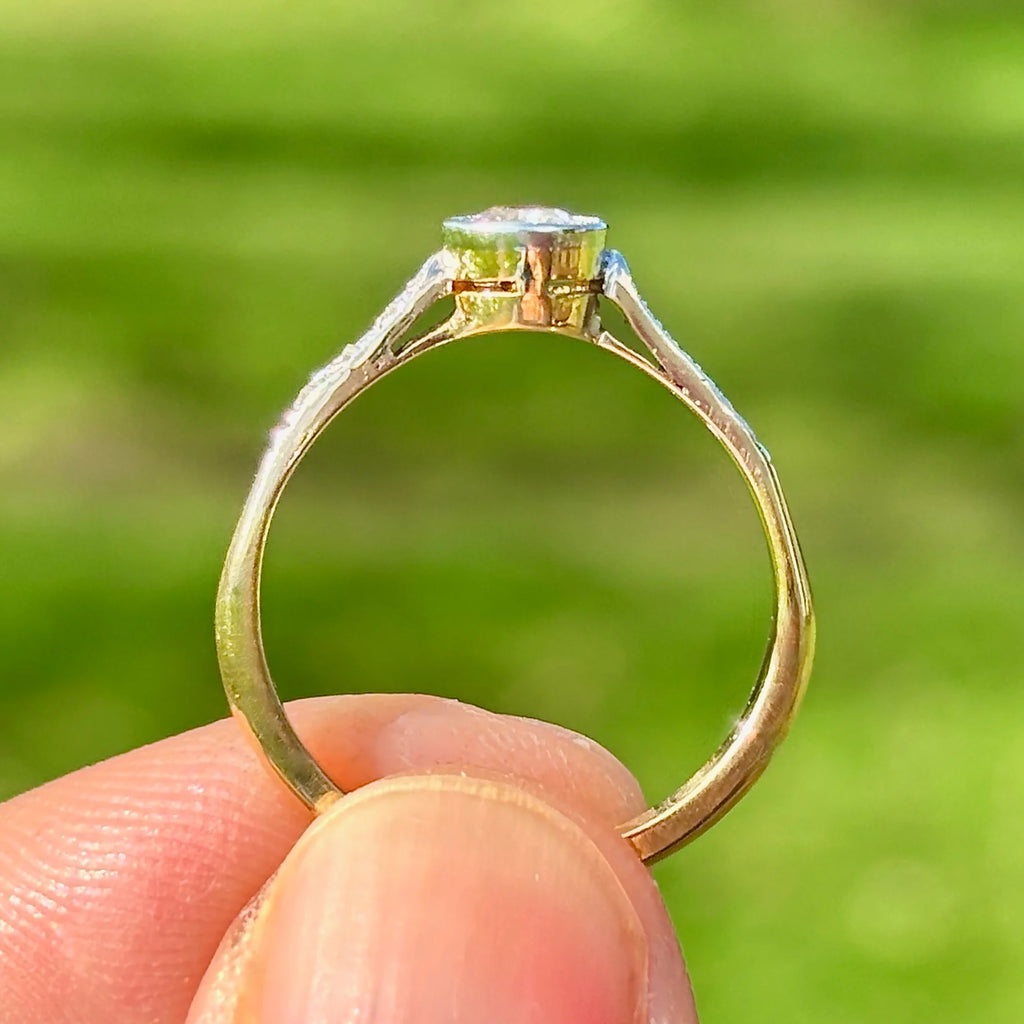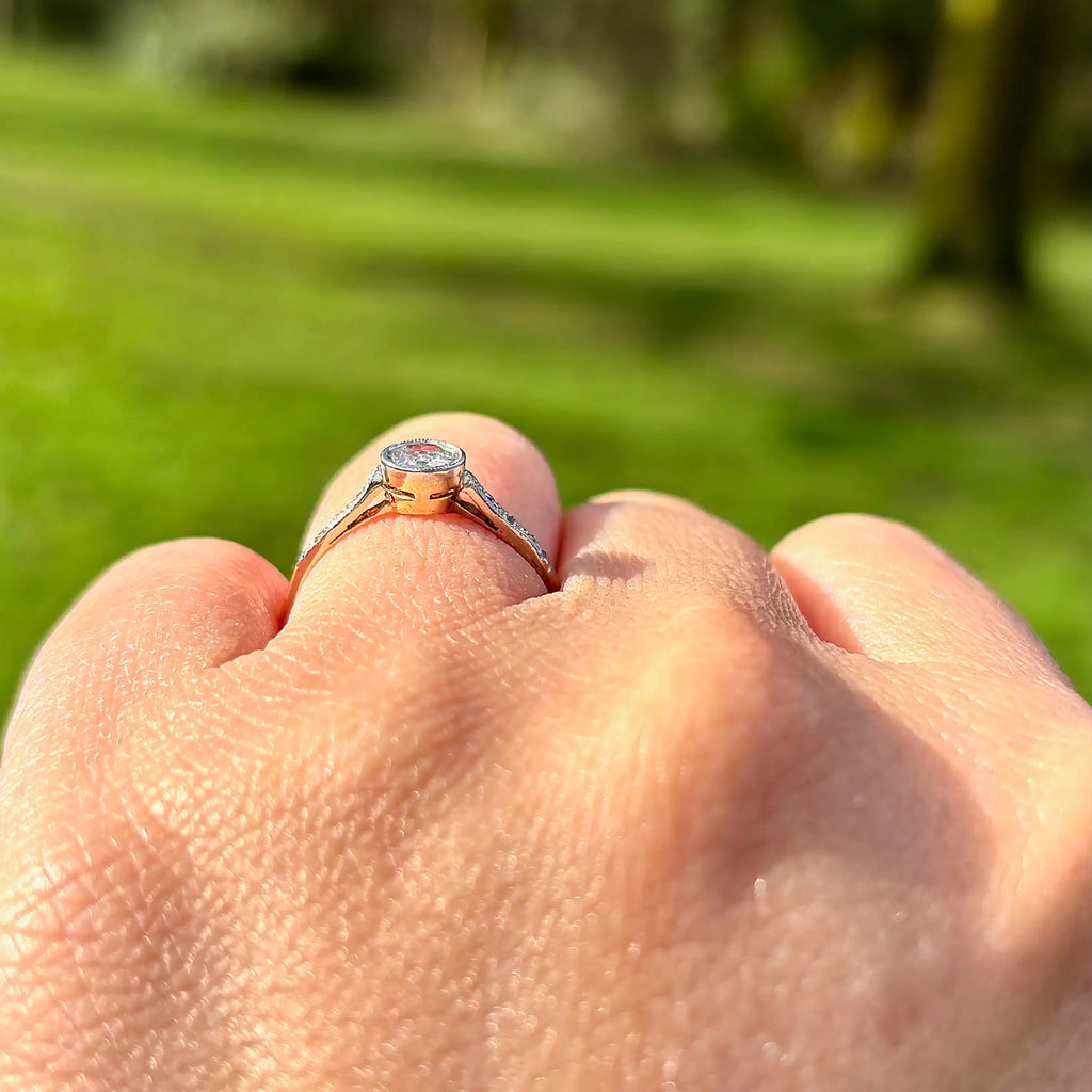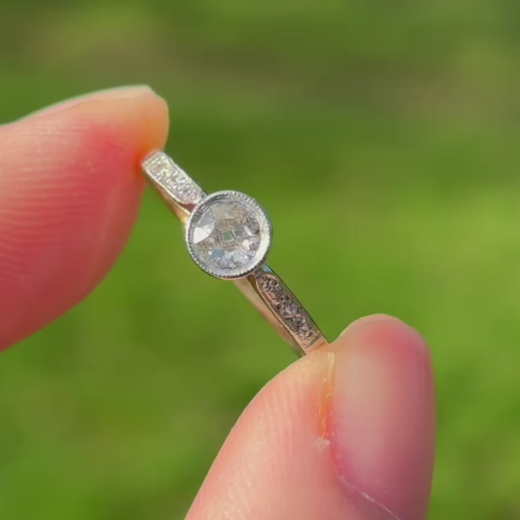 At its centre sits a sparkling hand-cut Old European Cut diamond, rub-over set within a platinum-topped bezel and framed by fine millgrain detailing that adds texture and vintage charm. Small accent diamonds set into the shoulders provide subtle flashes of light, enhancing the ring’s overall sparkle.