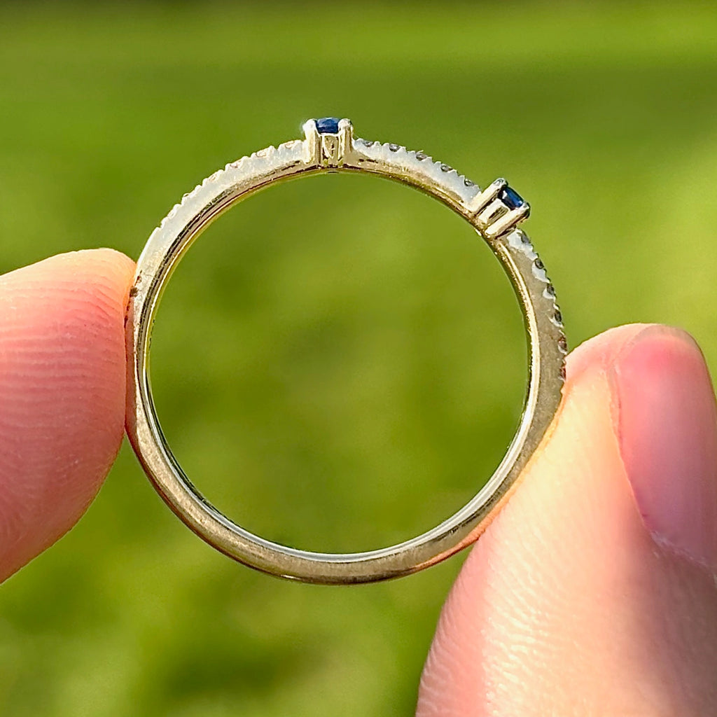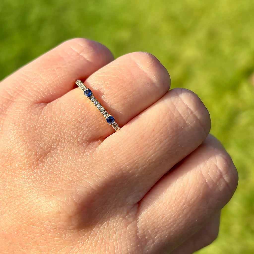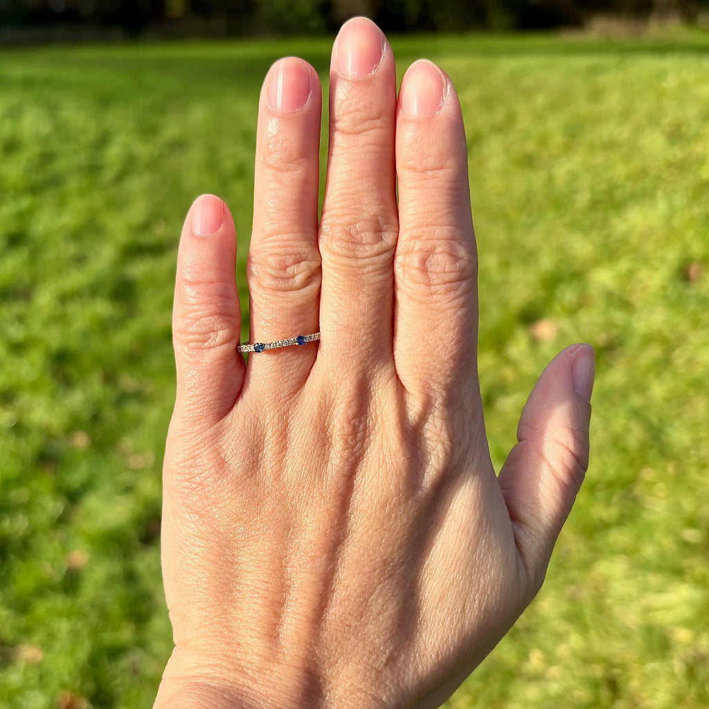 The band is finely proportioned, with small round sapphires spaced evenly between pavé-set diamonds, creating a subtle rhythm of colour and brilliance across the top of the ring. Its slim profile makes it particularly well suited for stacking, pairing alongside an engagement ring, or wearing as an elegant standalone piece.