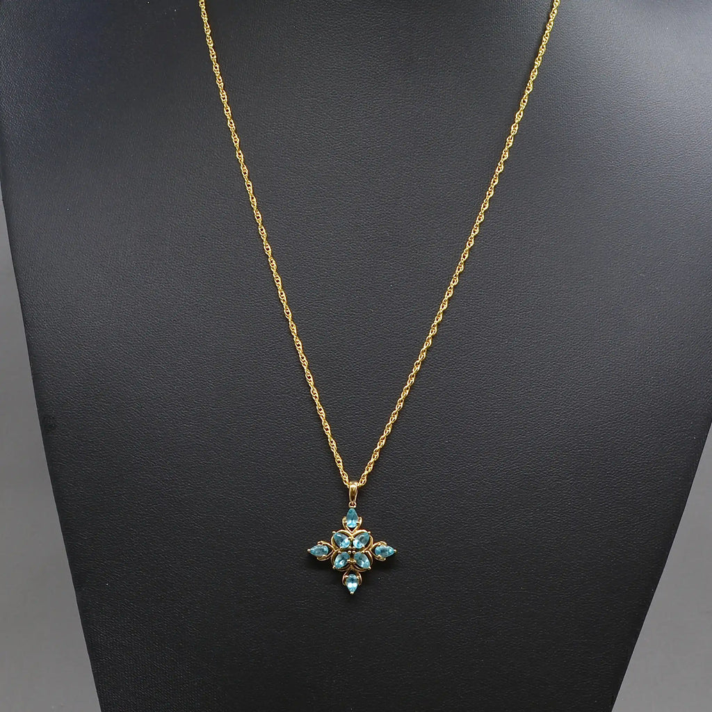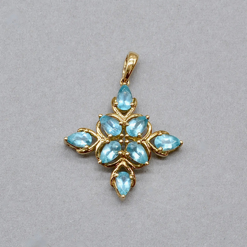 This vibrant vintage pendant radiates colour and energy, centred around a captivating cluster of natural neon blue apatites that shimmer with tropical brilliance. Each pear-shaped Apatite displays the striking electric blue hue for which apatite is so loved, arranged in a floral-inspired cluster that catches the light beautifully from every angle.