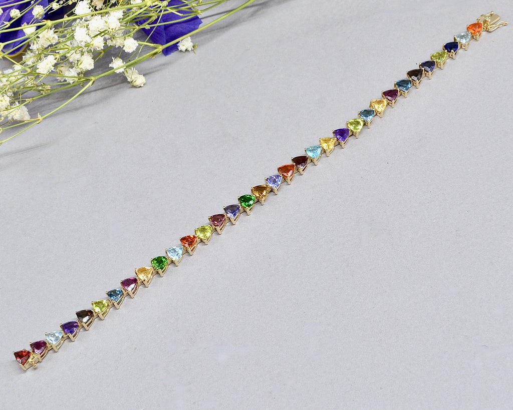 This elegant 9ct yellow gold bracelet is set with a vibrant sequence of natural gemstones, each 5mm trillion cut and individually claw-set, arranged in a striking rainbow palette. The carefully selected stones create a lively yet refined look, with beautiful contrast between the warm gold and the rich spectrum of colours.
