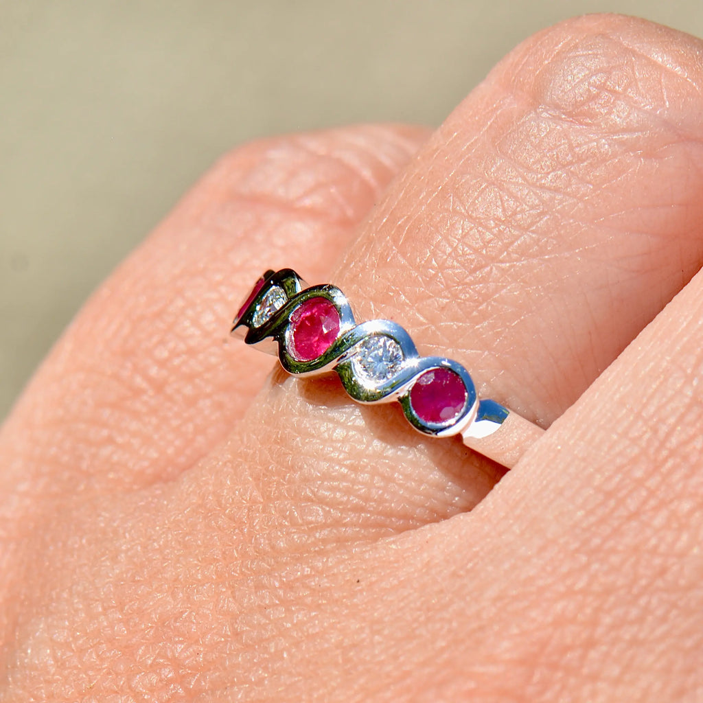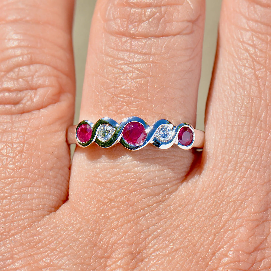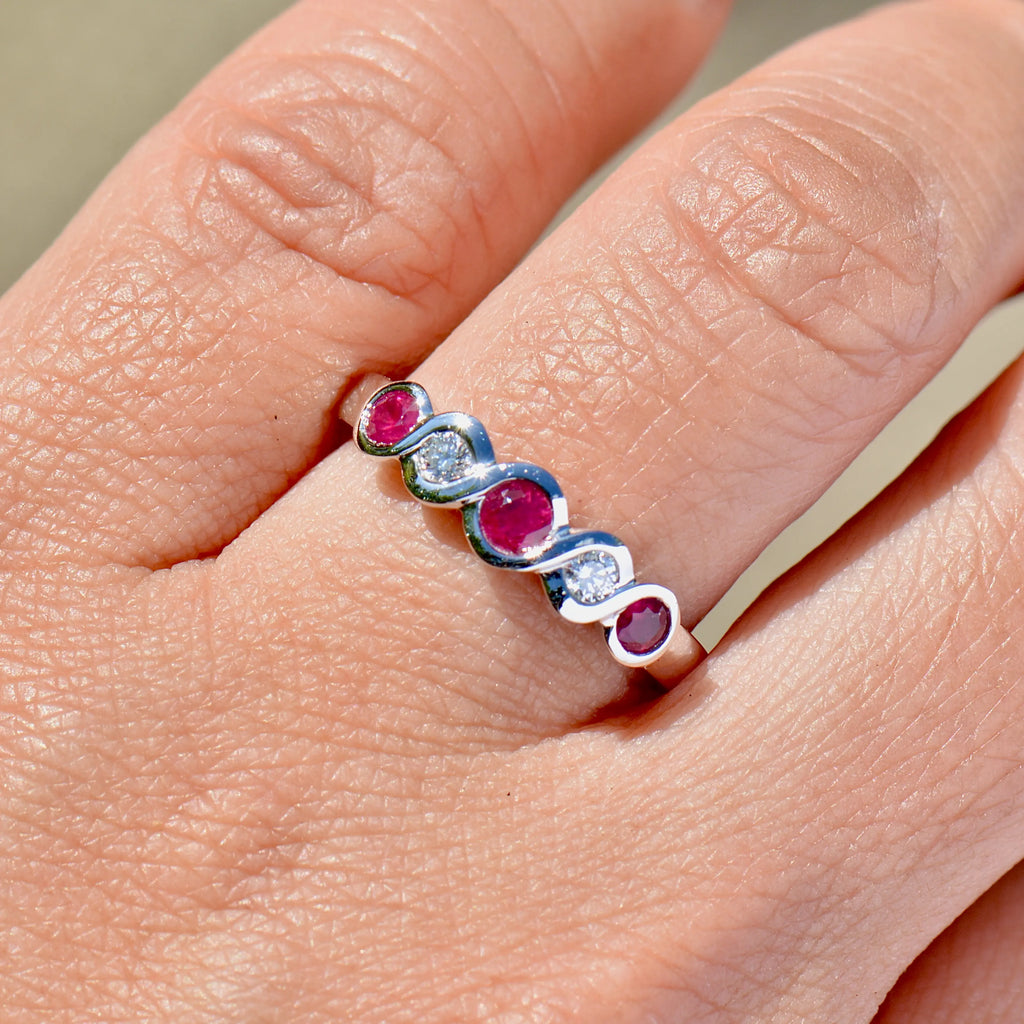 A sleek and elegant band with timeless symbolism, this five-stone design features three natural rubies in rich raspberry-red hues, accented by two sparkling natural diamonds. Arranged in an infinity-inspired sequence, the stones represent everlasting love and unity.