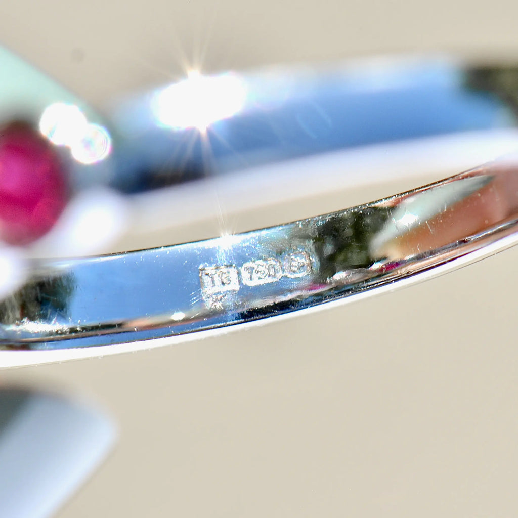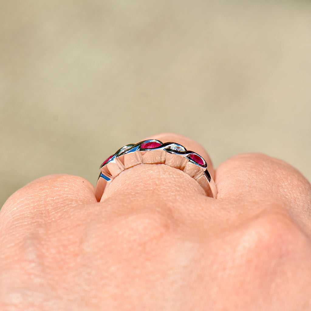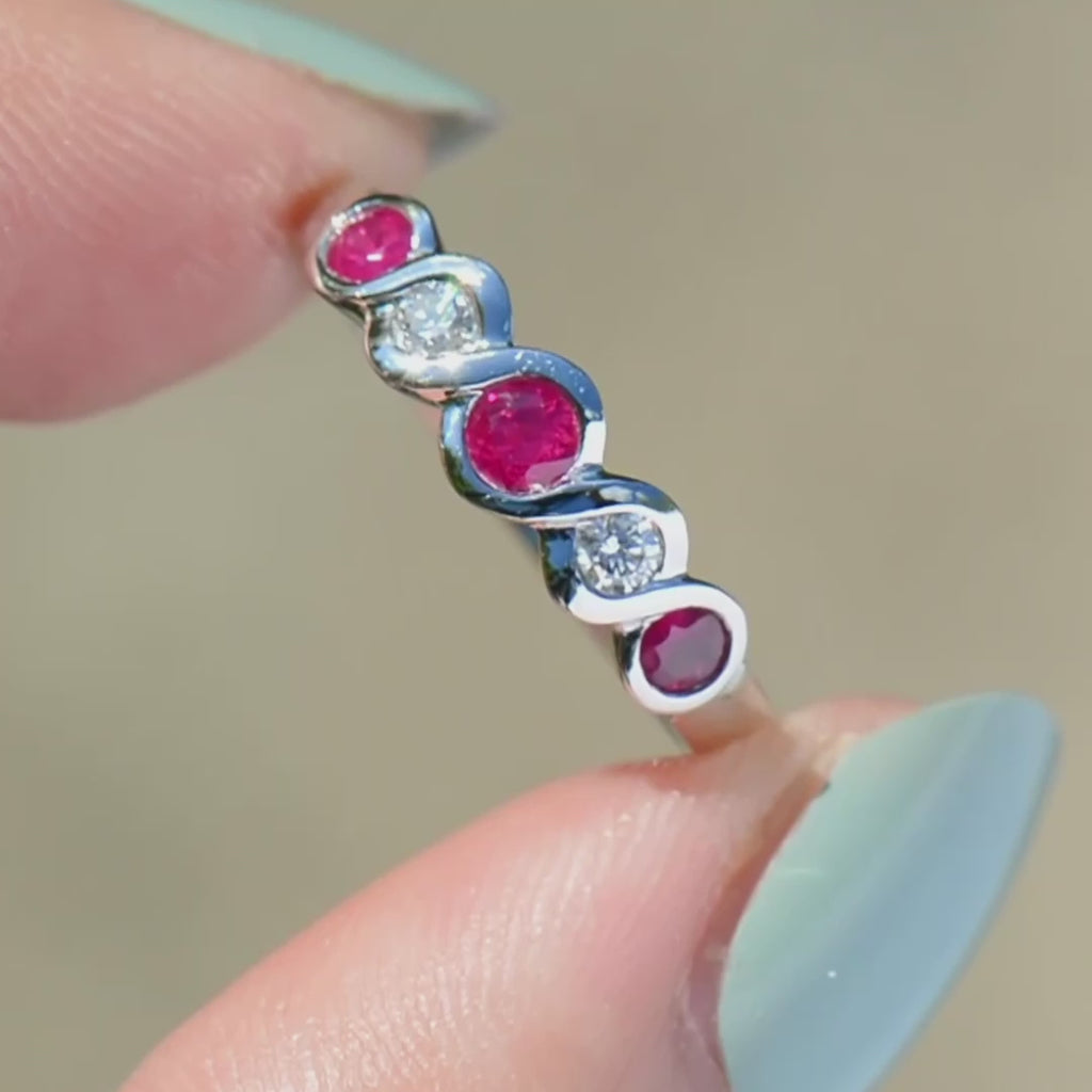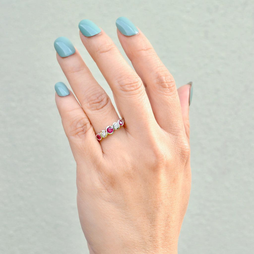 A sleek and elegant band with timeless symbolism, this five-stone design features three natural rubies in rich raspberry-red hues, accented by two sparkling natural diamonds. Arranged in an infinity-inspired sequence, the stones represent everlasting love and unity.