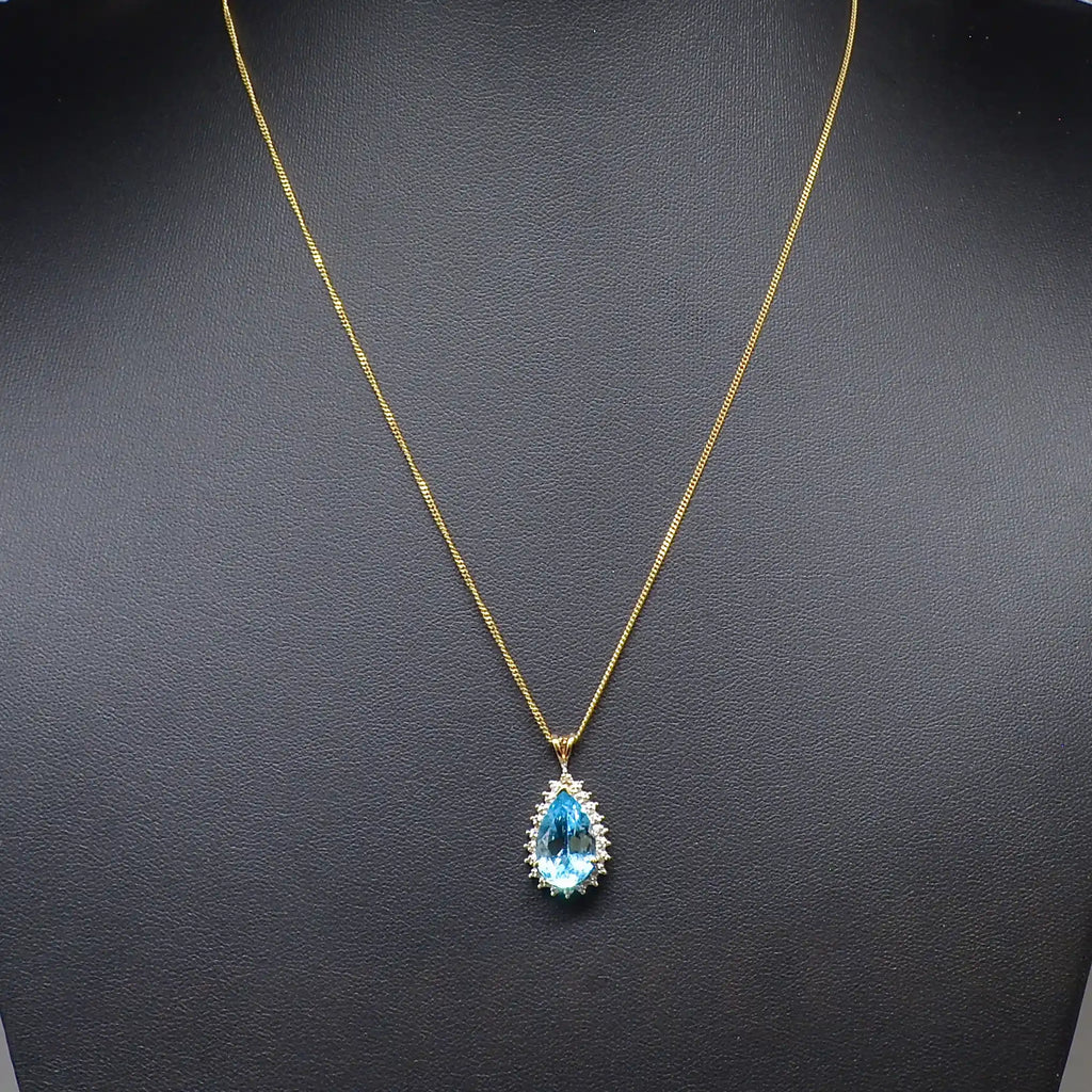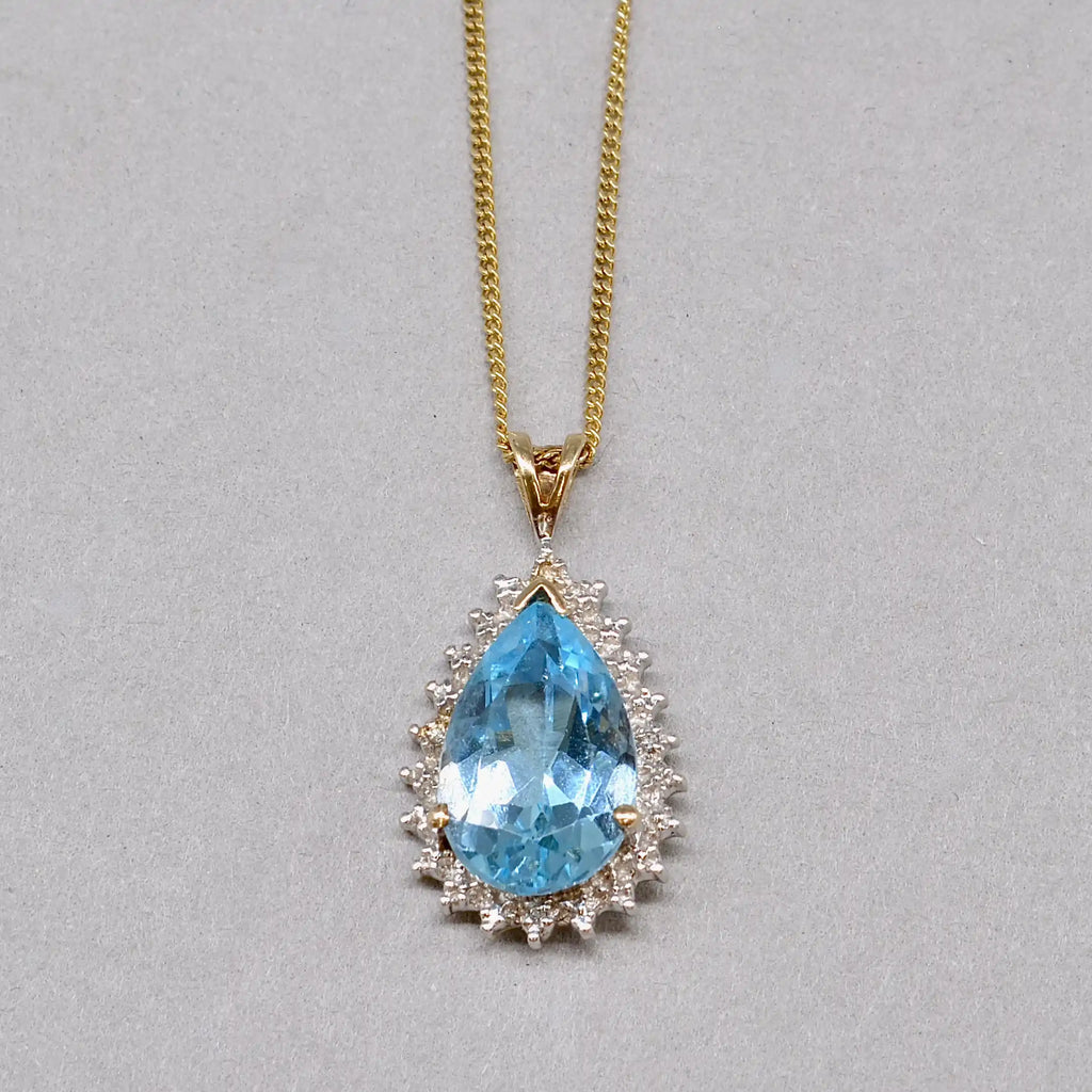 This stunning pendant and chain set showcases the timeless beauty of Swiss blue topaz, celebrated for its clear, sky-bright hue and radiant brilliance. The pendant features a single pear-shaped Swiss blue topaz gracefully accented by four natural diamonds in illusion set that add a delicate sparkle and refined contrast.