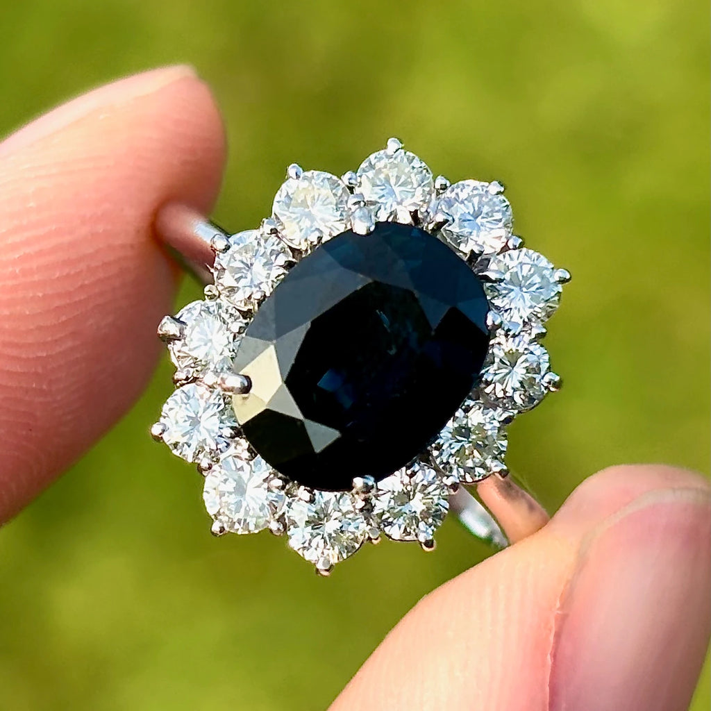 At the centre of this vintage piece sits a richly saturated natural sapphire with deep, velvety blue, almost midnight in tone. As it moves, subtle flashes of royal blue emerge from within, revealing layers of depth that only a natural stone can offer.