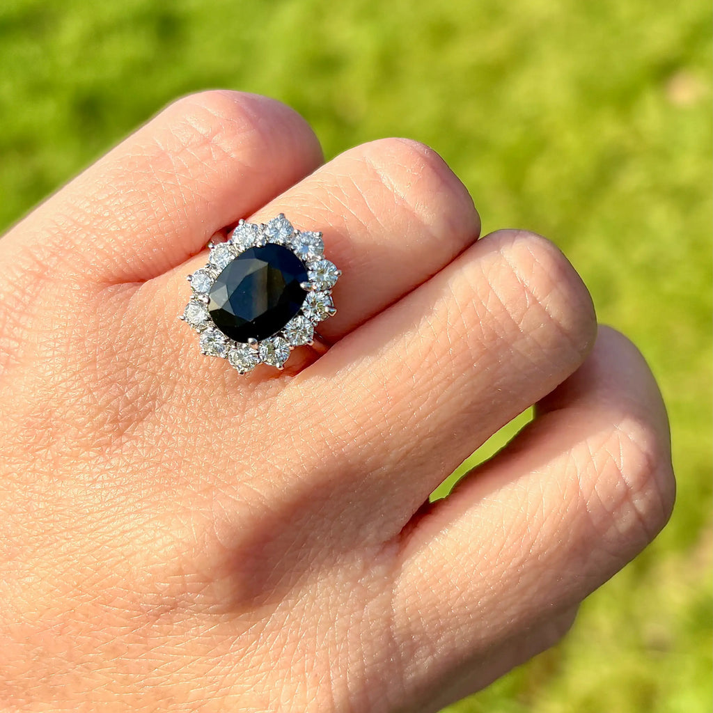 Around it, a constellation of brilliant diamonds gathers in a perfectly proportioned halo. Each stone is individually claw-set, allowing light to enter freely, so the frame shimmers with life. Against the sapphire’s velvety richness, the diamonds feel almost electric, creating a striking interplay between shadow and brilliance.