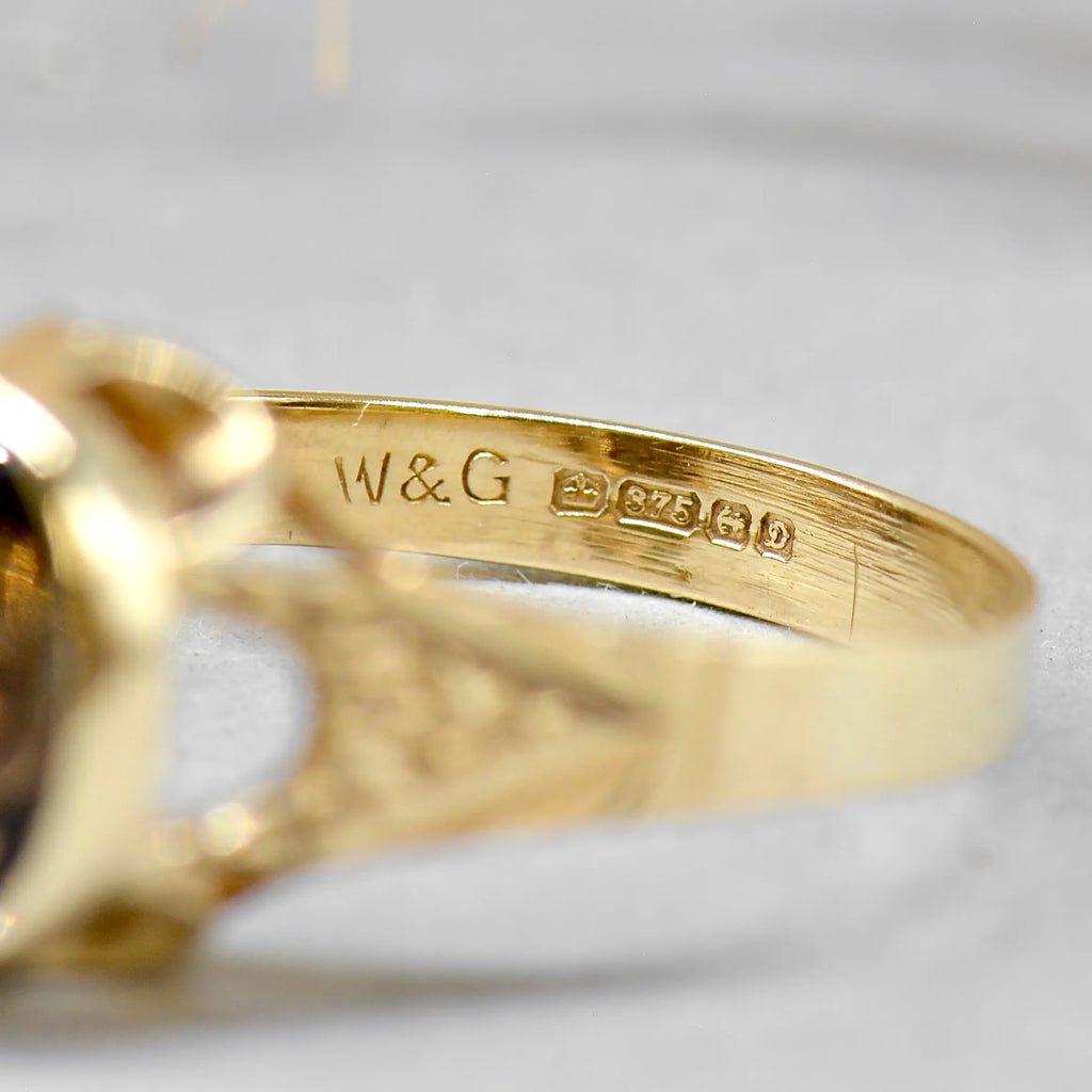 This striking vintage ring captures the bold, sculptural aesthetic of the 1970s, showcasing a richly hued natural smoky quartz set in warm 9ct yellow gold. The smoky quartz is securely bezel-set, its deep, smoky-brown tone accentuated by the geometric contours of the mount.