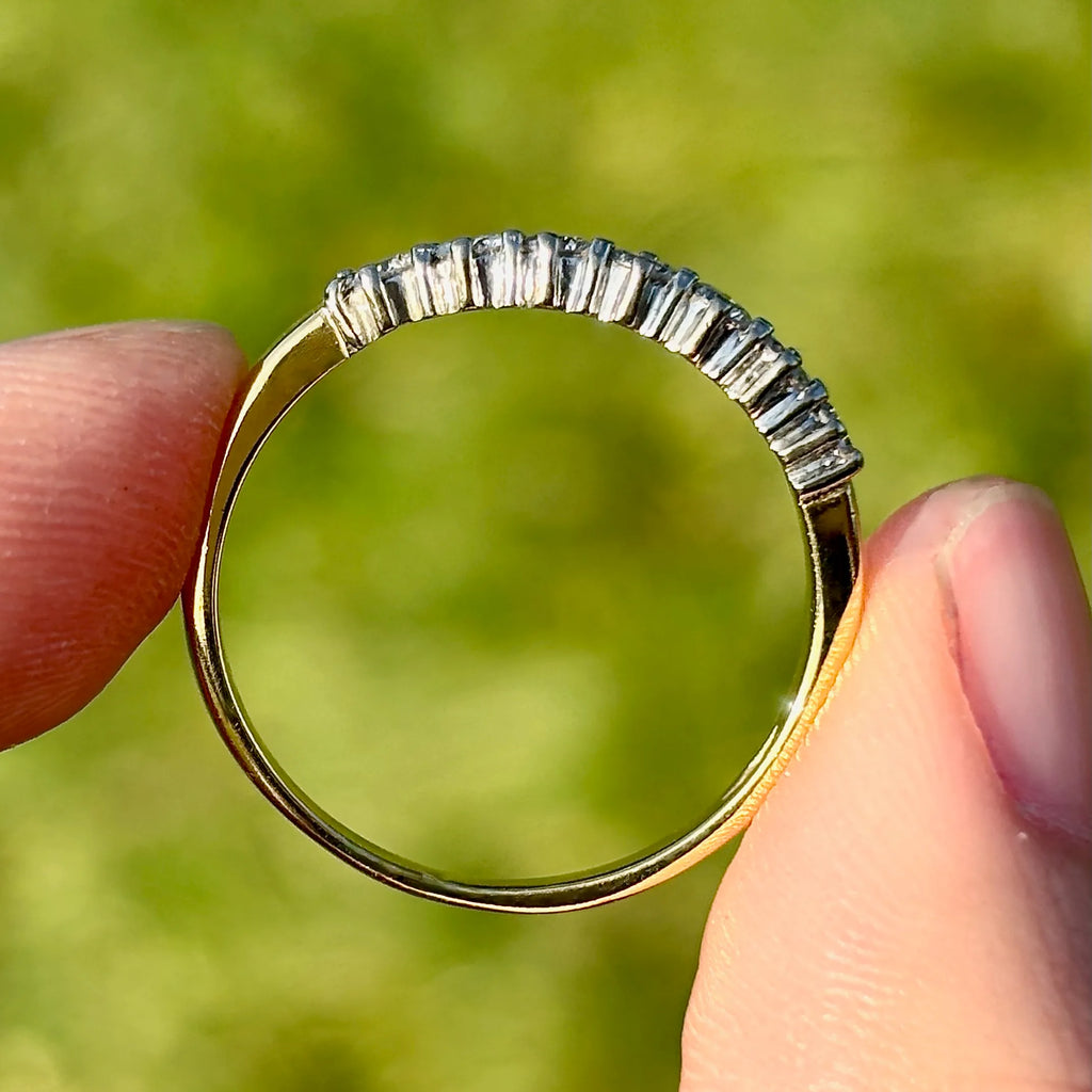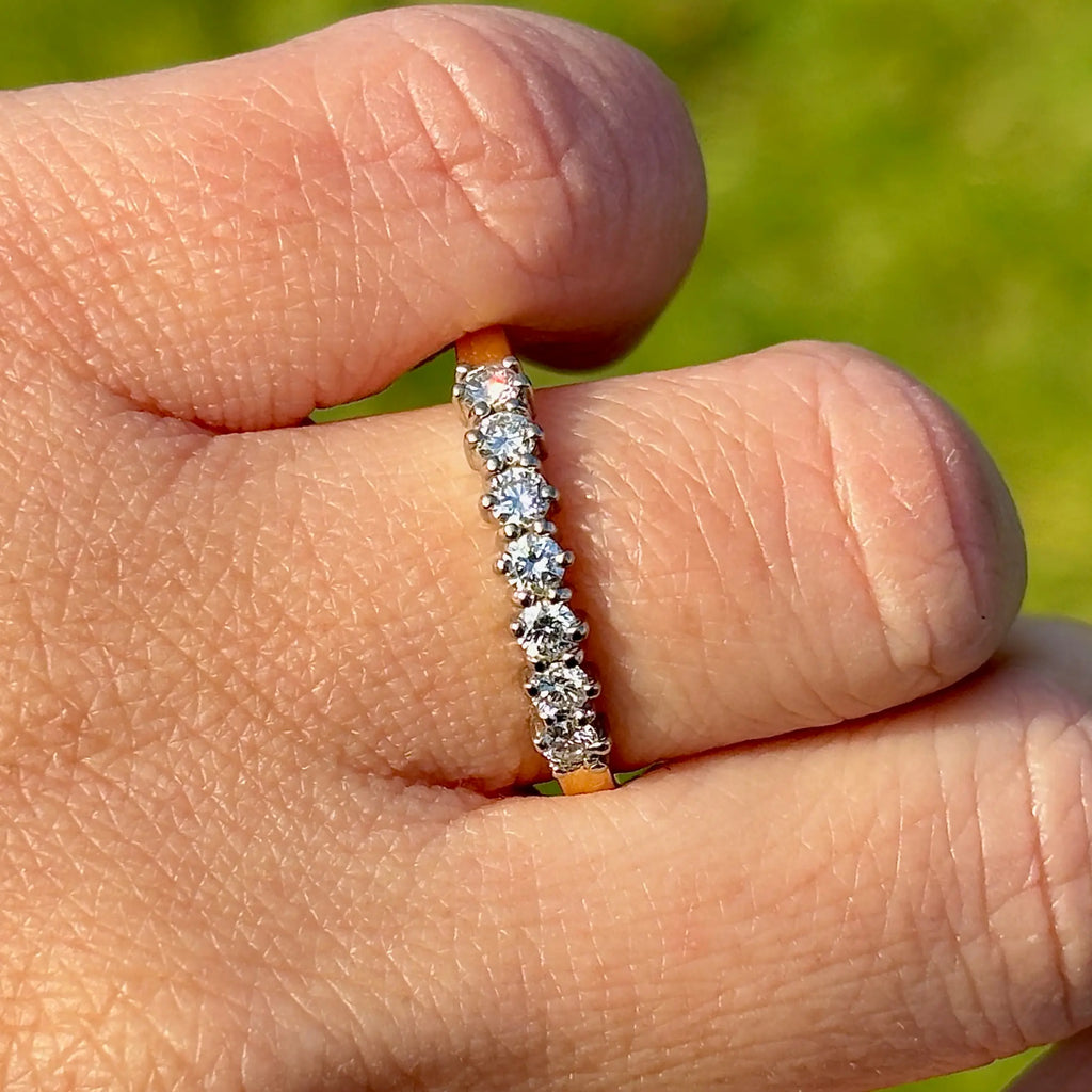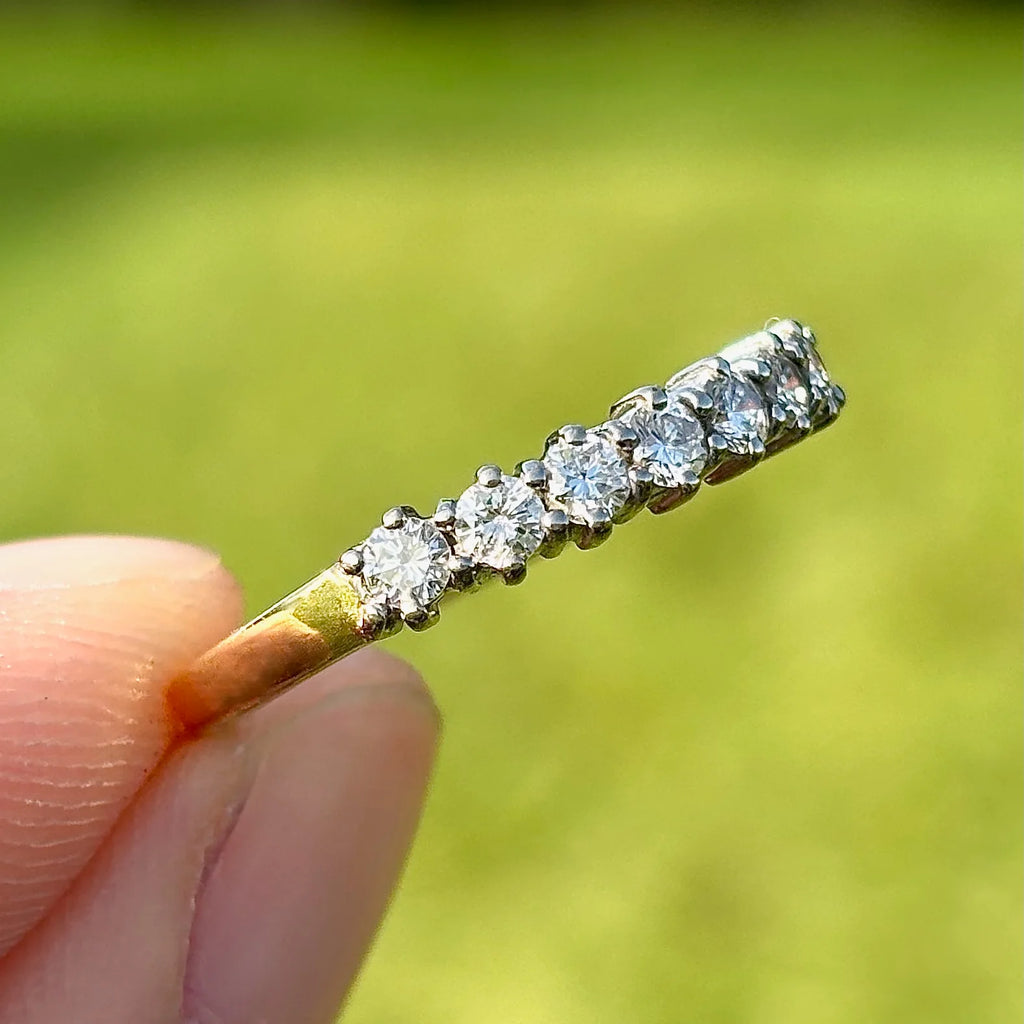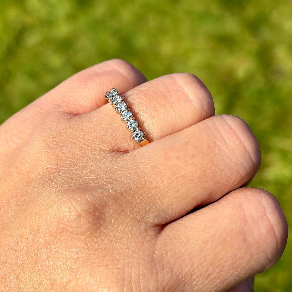 This beautiful vintage 1980s diamond half eternity ring is crafted in rich 18ct yellow gold and set with seven sparkling natural diamonds in a classic four-claw design. With approximately 0.50ct total diamond weight, the row of bright round brilliant stones creates a timeless line of brilliance across the finger, making it perfect as a wedding band, anniversary ring, stacking ring, or a meaningful “forever” piece.
