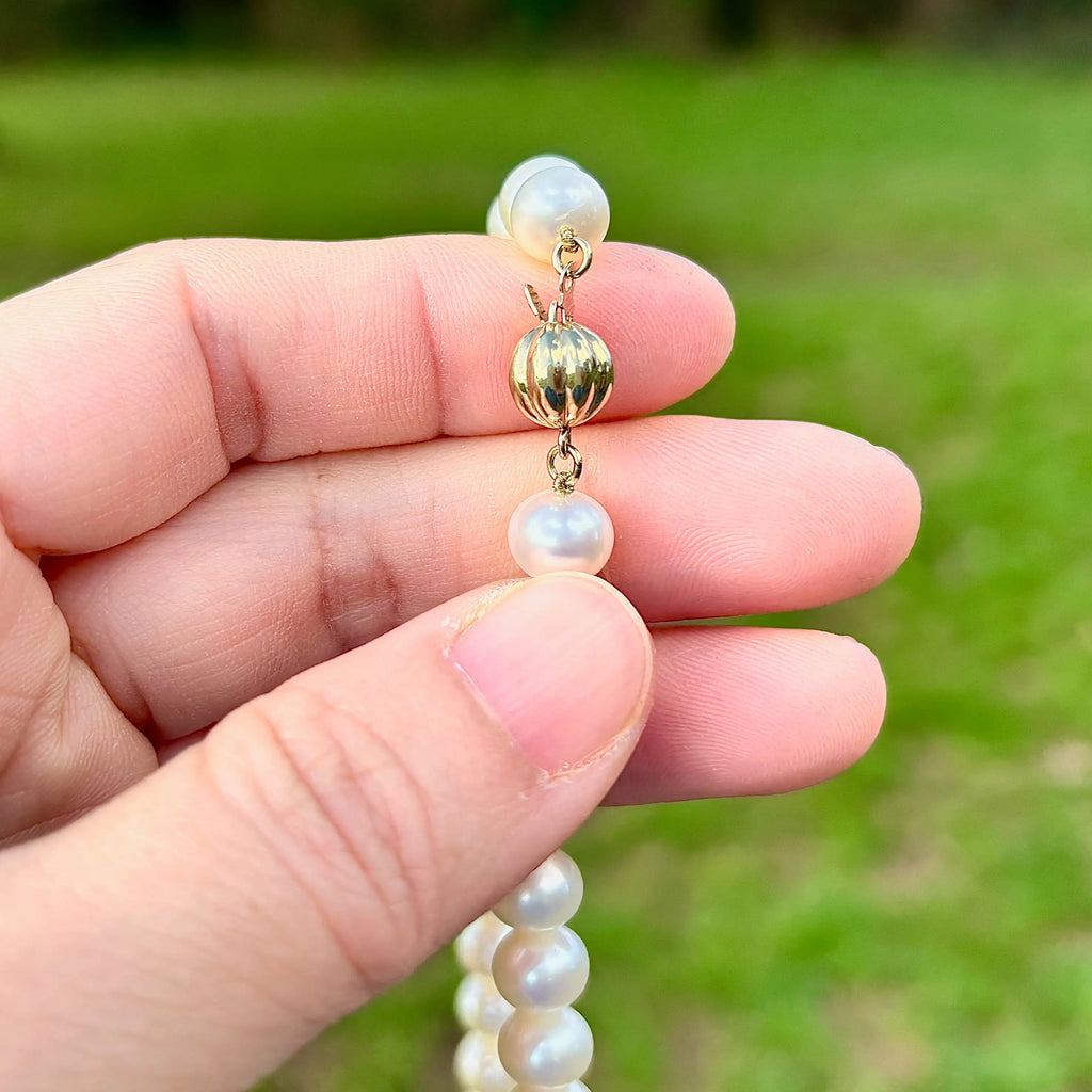 The strand is finished with a 9ct yellow gold ribbed spherical box clasp, a classic design that complements the pearls beautifully while providing secure fastening.