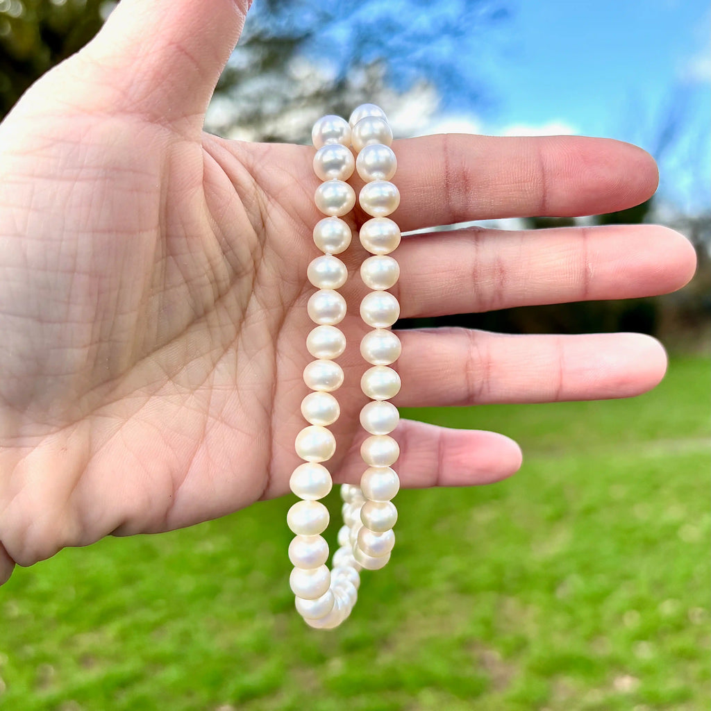 This vintage necklace is composed of luminous cultured pearls measuring approximately 7.5–8mm, a slightly larger size that gives the strand a beautiful presence when worn. Each pearl displays a soft creamy tone with gentle overtones and pleasing lustre, carefully matched to create a harmonious and balanced strand.