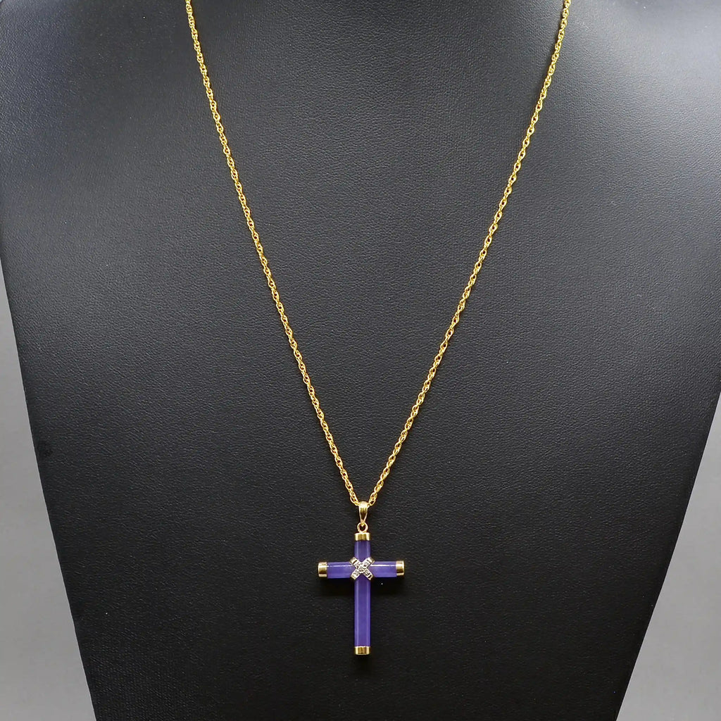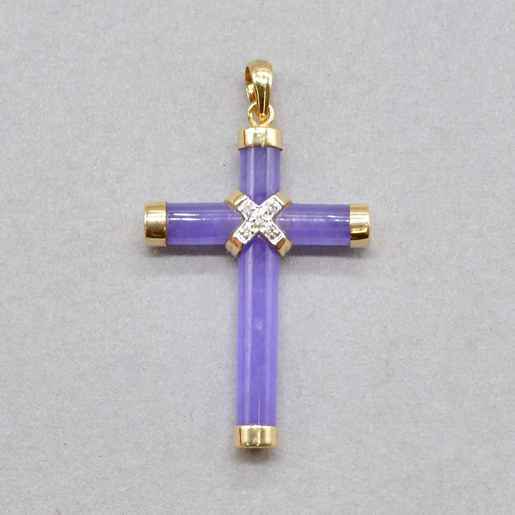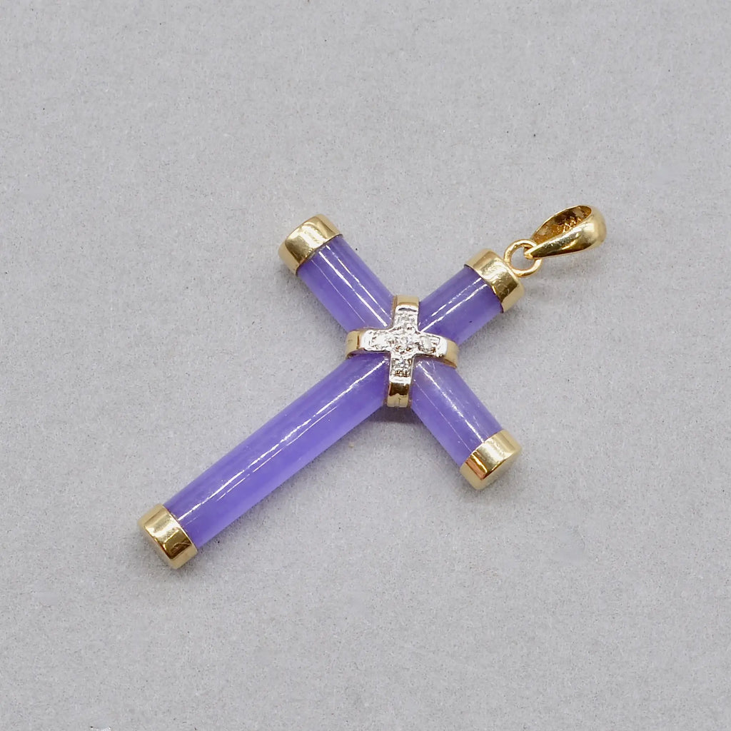 This elegant vintage cross pendant exudes calm sophistication, combining the gentle lilac hues of lavender jade with the subtle sparkle of diamond accents.