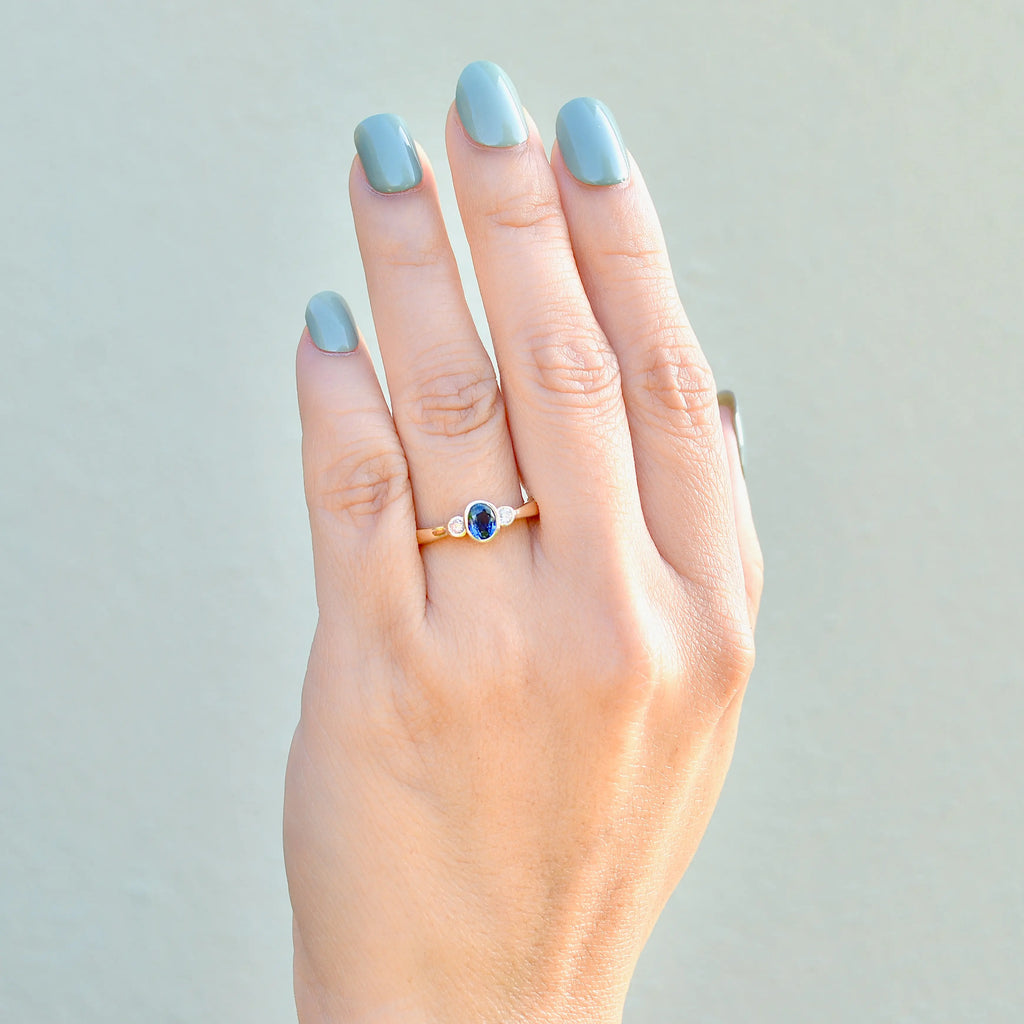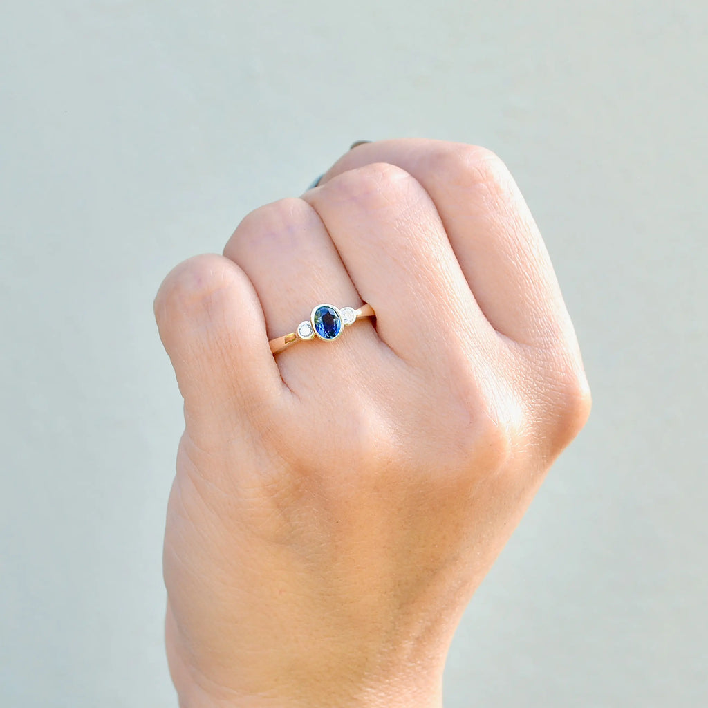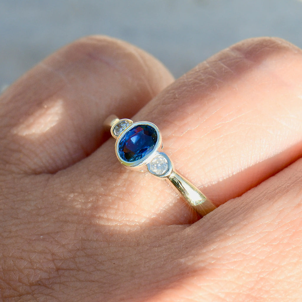 Crafted in 9ct yellow gold, the ring has a refined profile that sits comfortably on the hand, making it a wonderful choice as an engagement ring, anniversary piece or meaningful right-hand ring. The two natural diamonds add a touch of brilliance, beautifully complementing the sapphire while maintaining classic vintage charm.