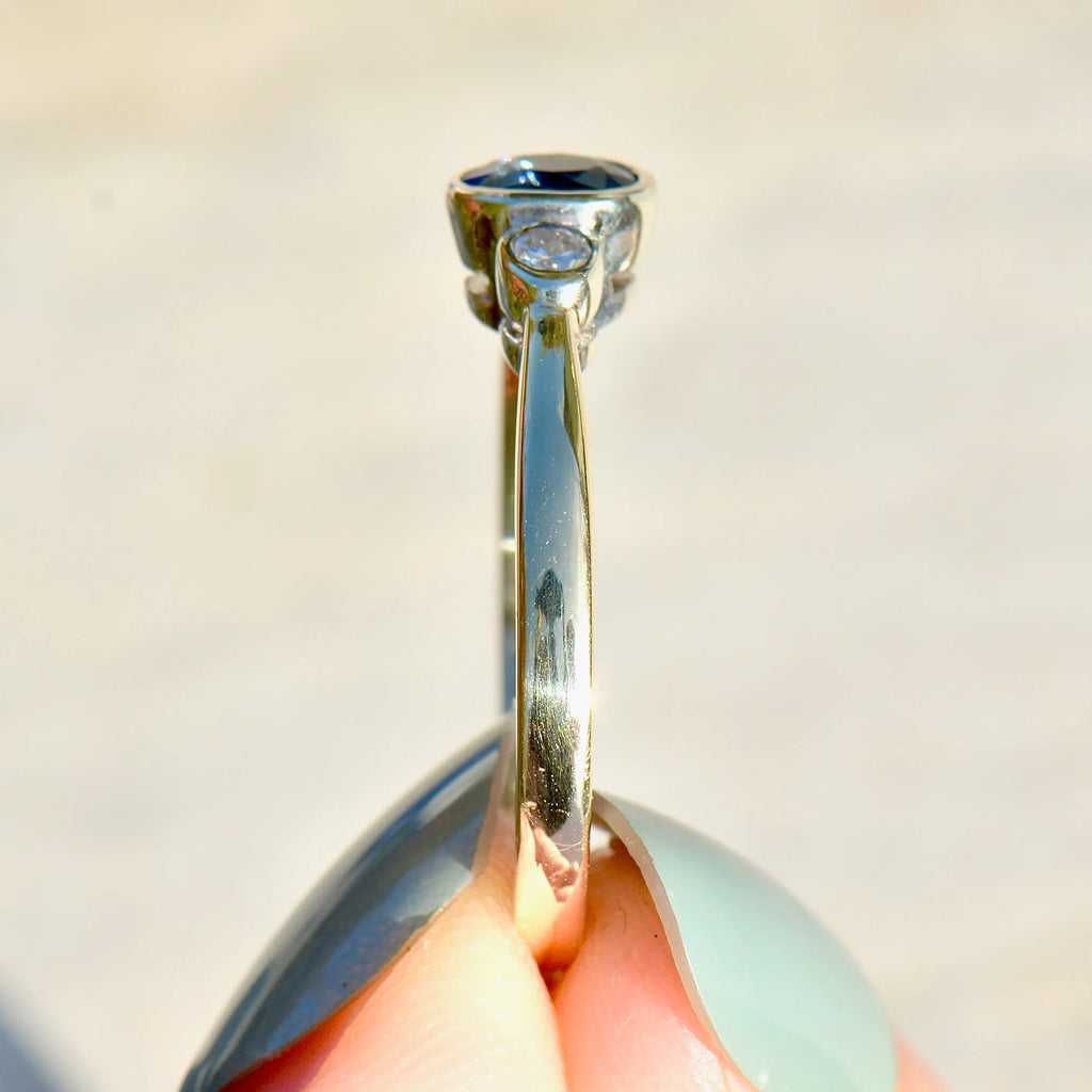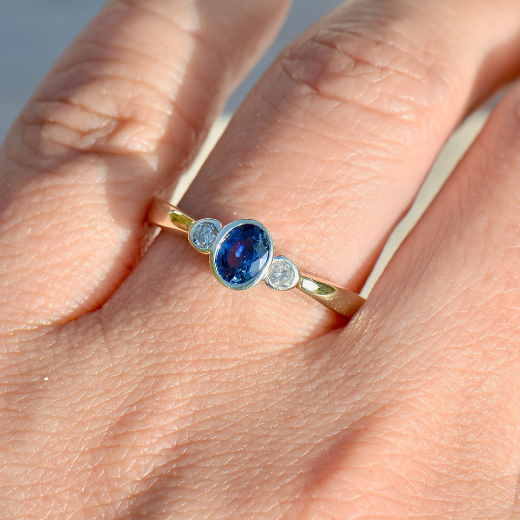 This beautiful vintage trilogy ring features a striking natural sapphire at its centre, flanked by two sparkling diamonds in a timeless three-stone design. The sapphire displays a lovely medium blue colour, highly sought after for its soft yet vibrant tone, and is securely bezel-set for both elegance and durability.