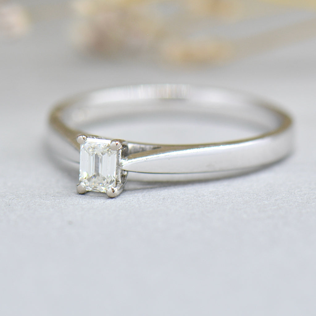 镶嵌在光滑的 18K 白金戒圈上,钻石尺寸为 0.25 克拉(4 毫米 x 3 毫米),评估的钻石净度为 VS1,颜色为 H/I。它非常明亮、火热、干净且非常显眼。祖母绿切割凸显了这颗钻石的高净度。