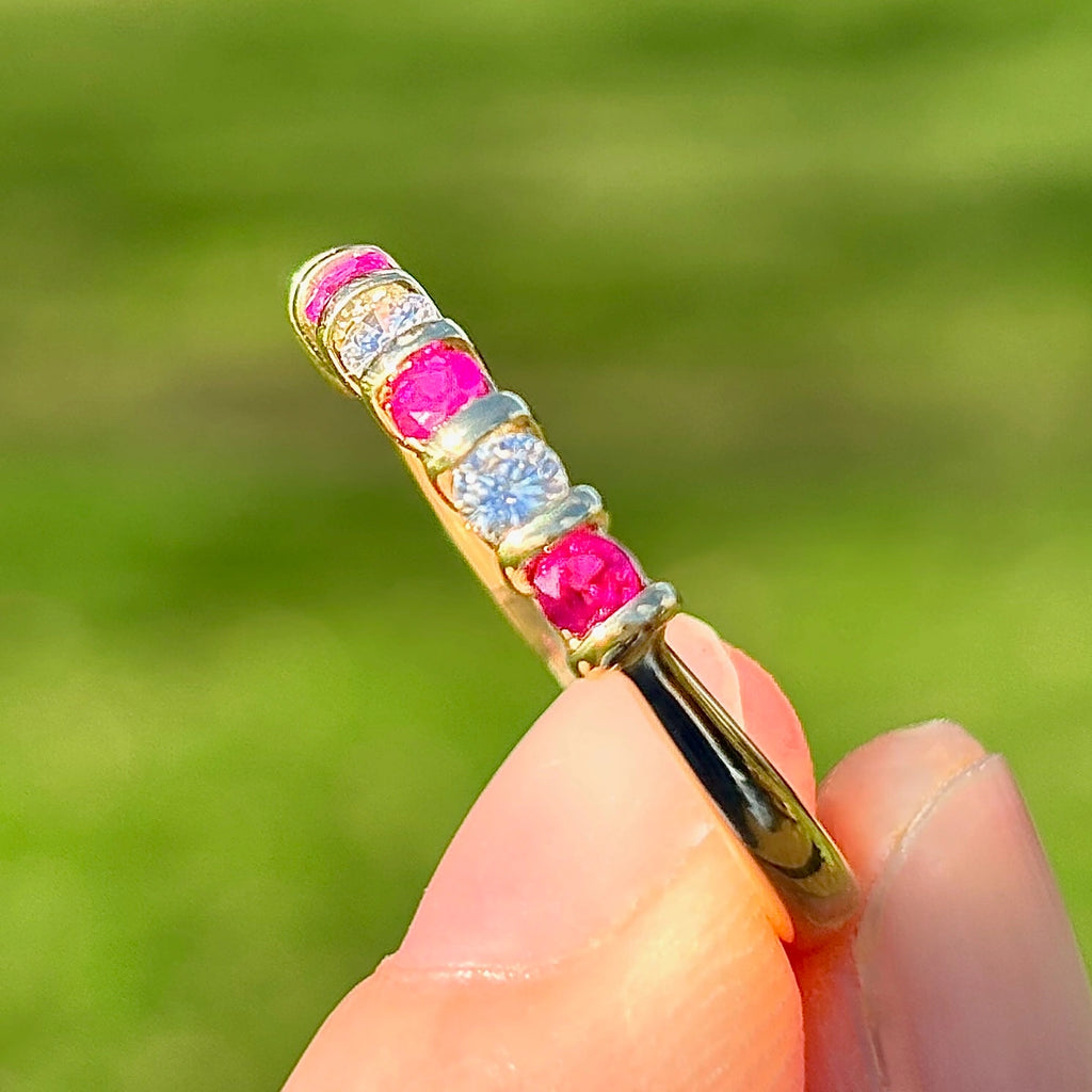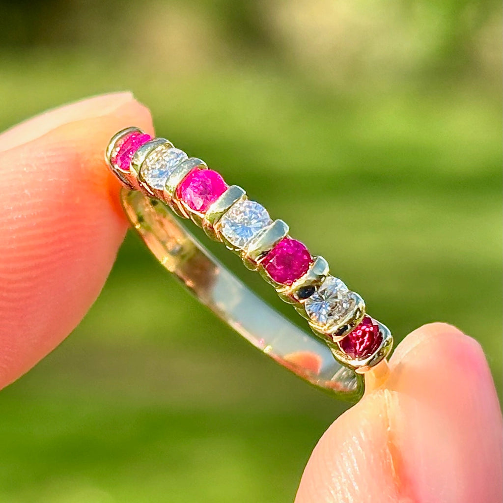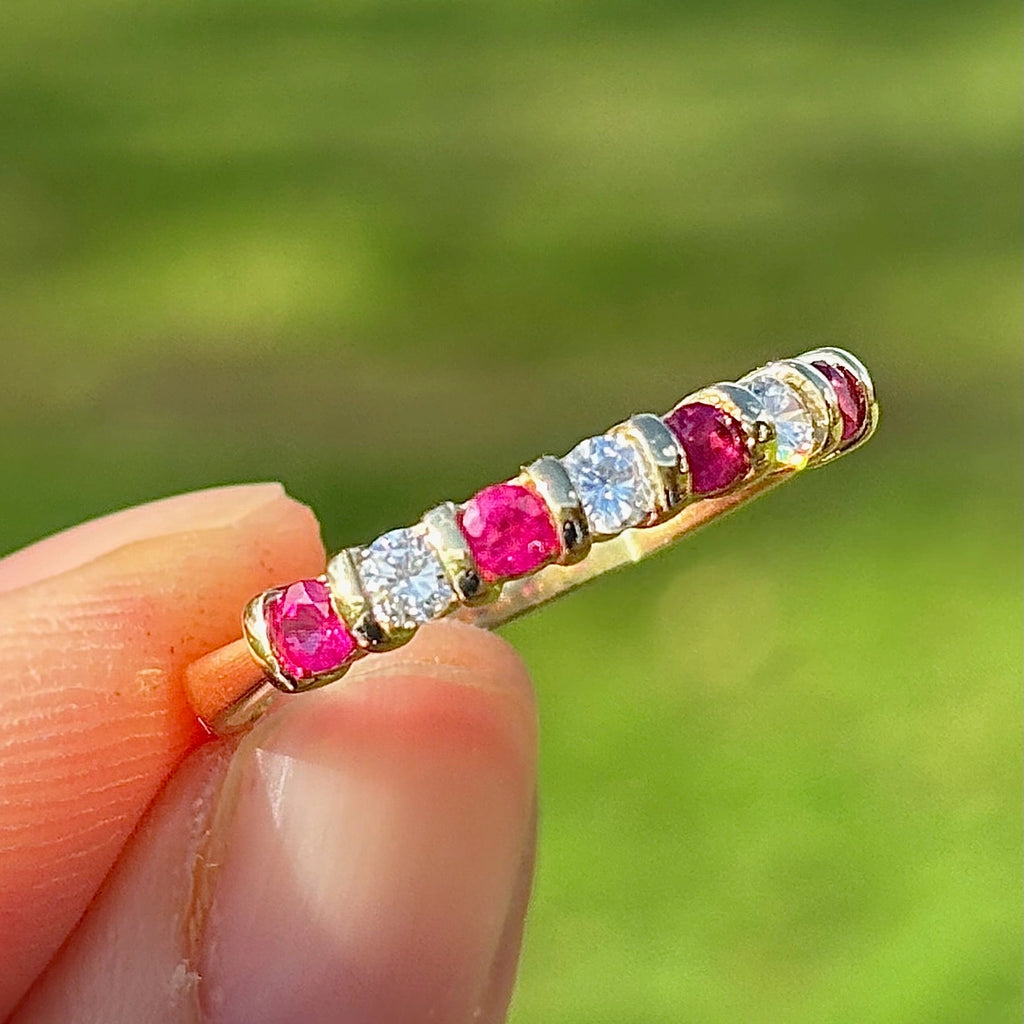 Set in warm 18ct yellow gold, the band features alternating rubies and diamonds arranged in a graceful row across the top of the ring. The lively pinkish-red rubies provide a beautiful pop of colour, while the diamonds add flashes of brilliance, creating a balanced and eye-catching design.