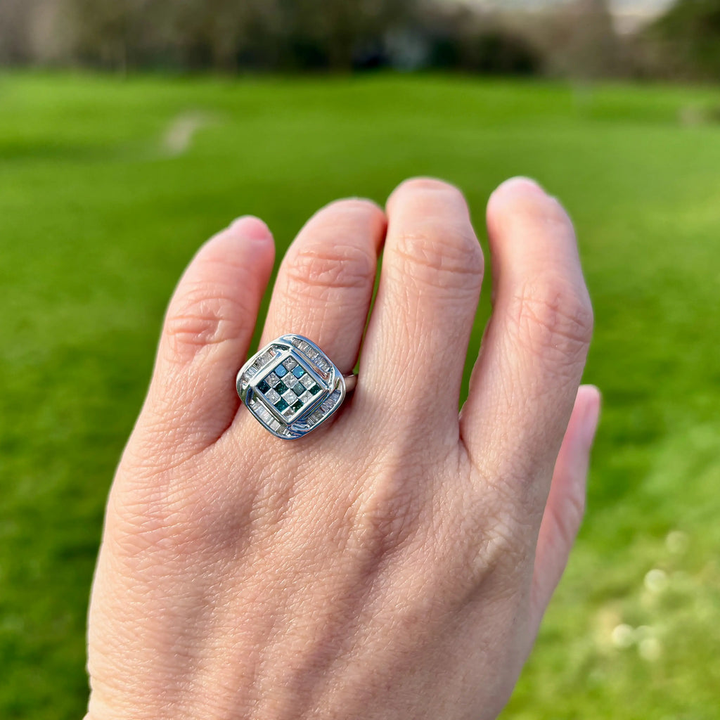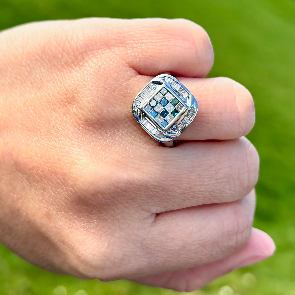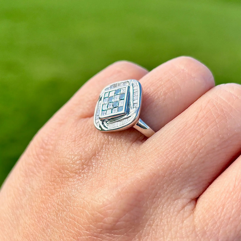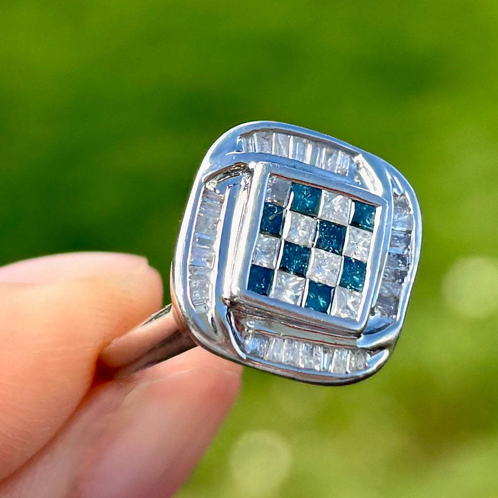 这是一款引人注目且现代的群镶戒指,具有独特的几何设计。中央,蓝色和白色公主方形切割钻石交替排列,采用隐形镶嵌,形成无缝、清晰、结构化且不间断的棋盘格图案。