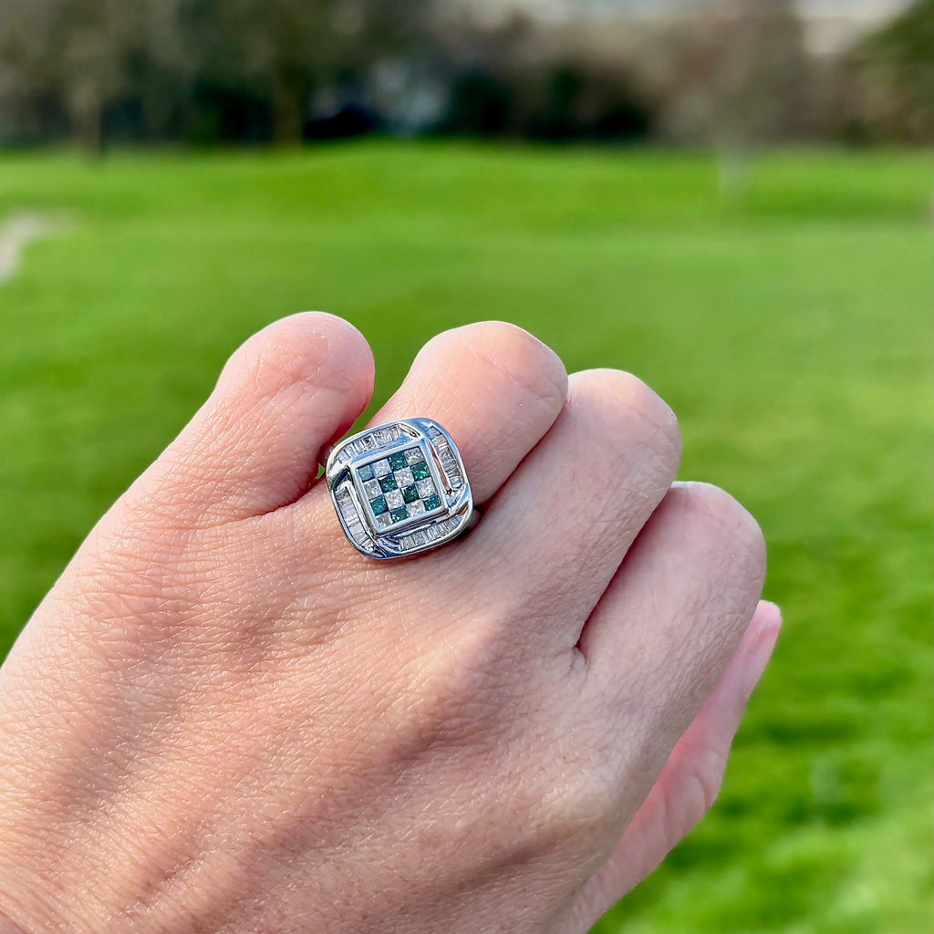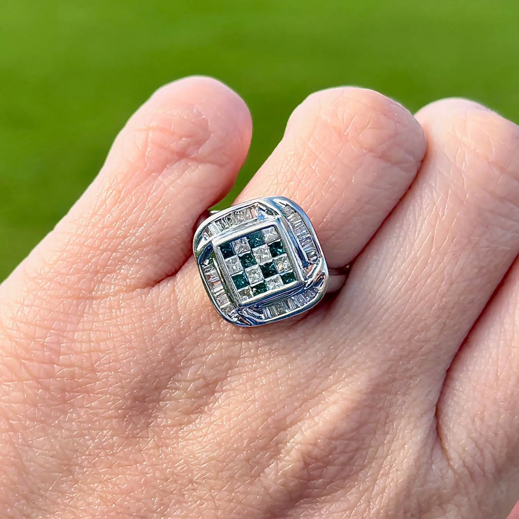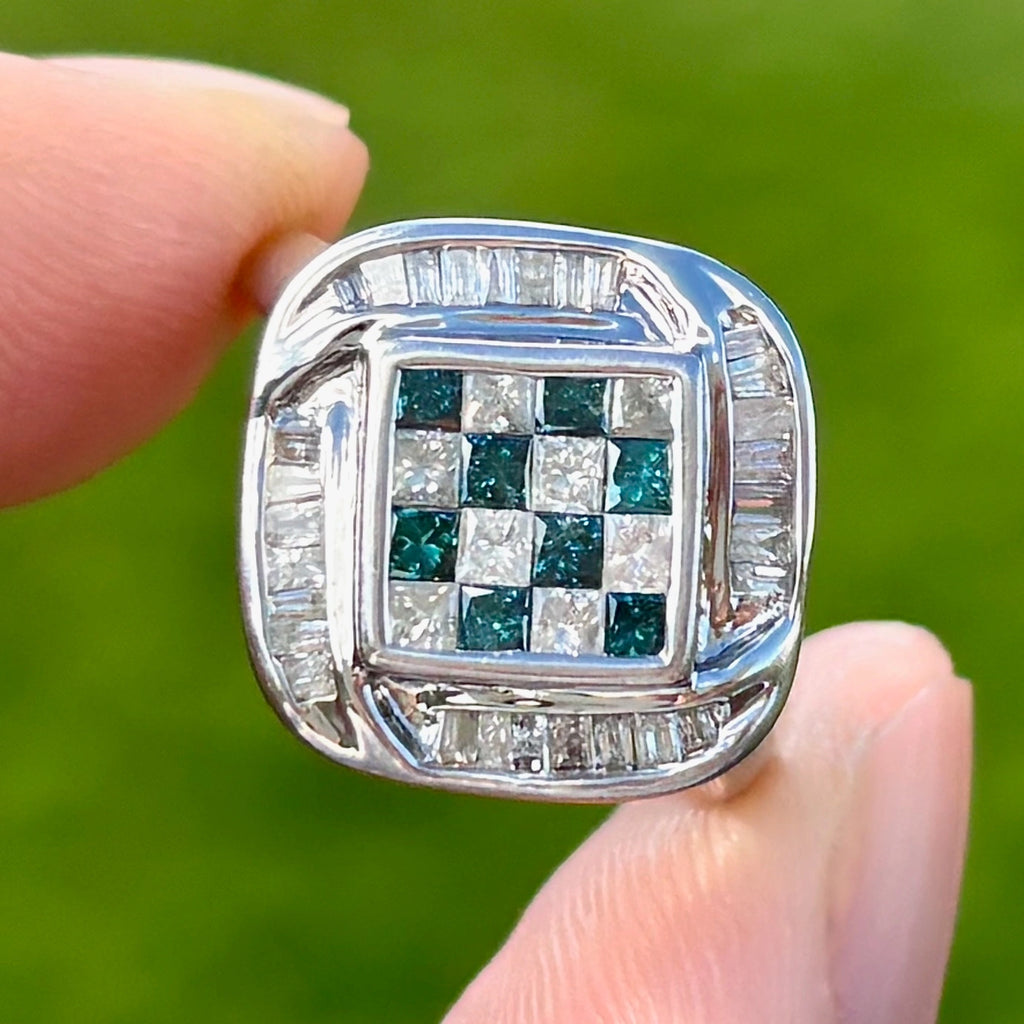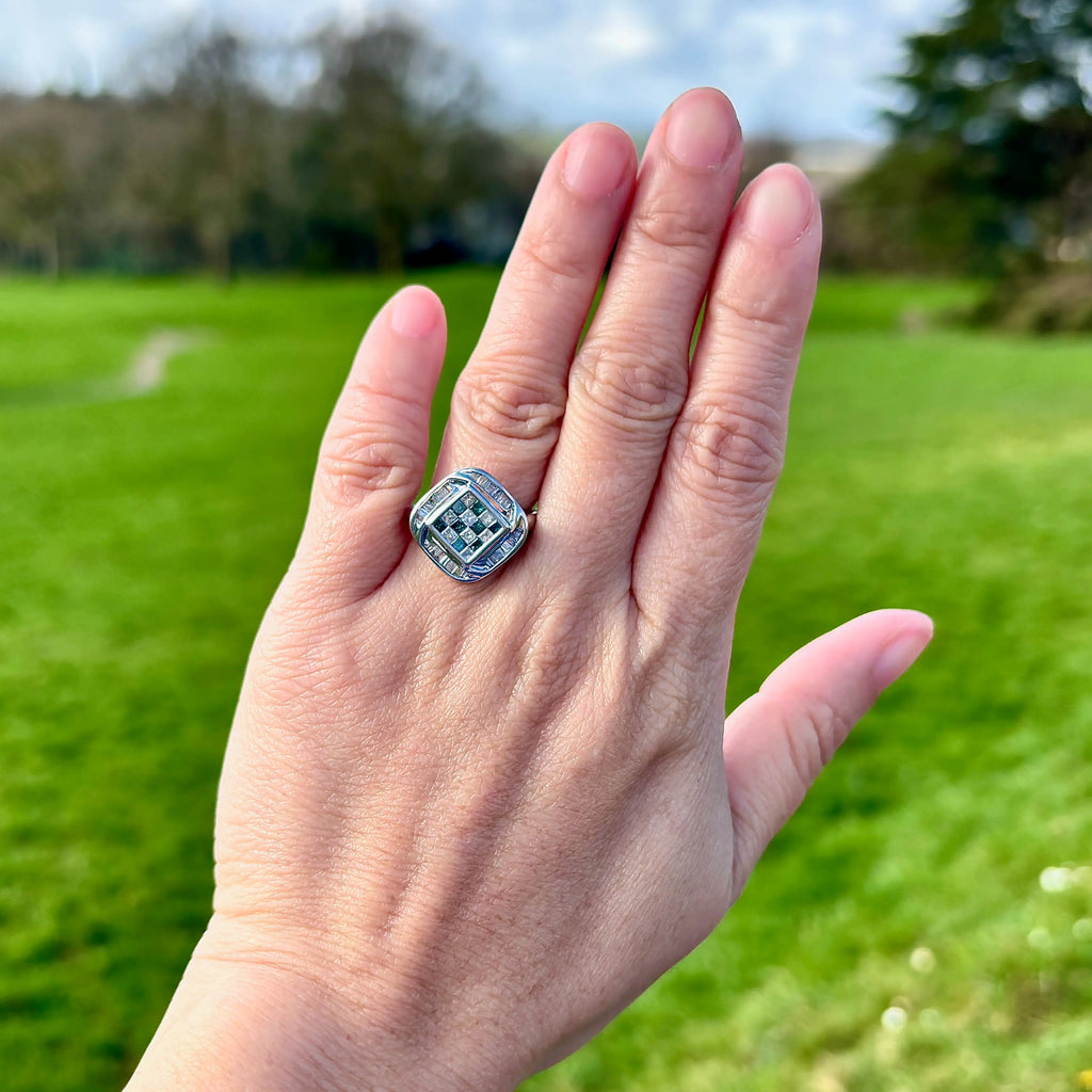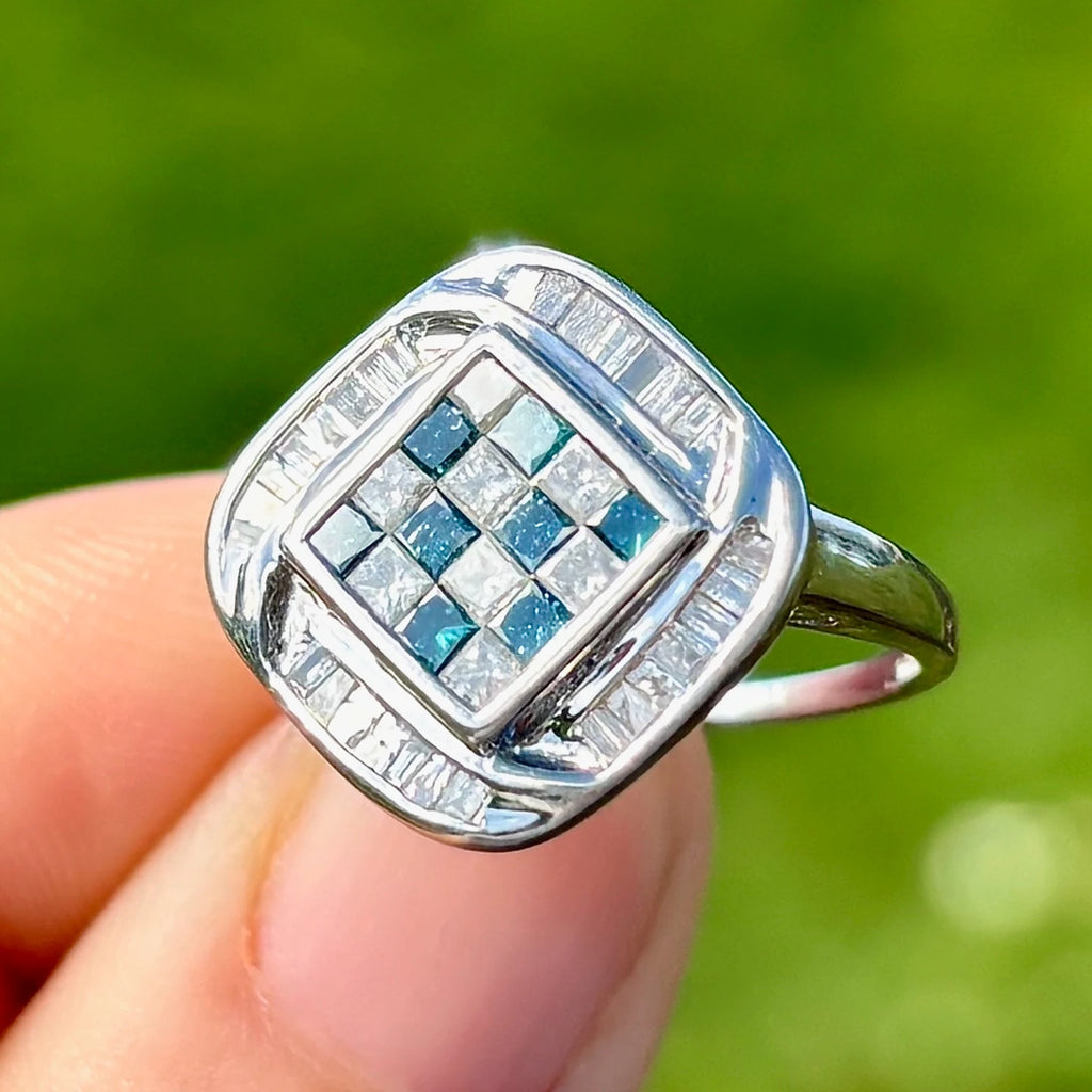 这是一款引人注目且现代的群镶戒指,具有独特的几何设计。中央,蓝色和白色公主方形切割钻石交替排列,采用隐形镶嵌,形成无缝、清晰、结构化且不间断的棋盘格图案。