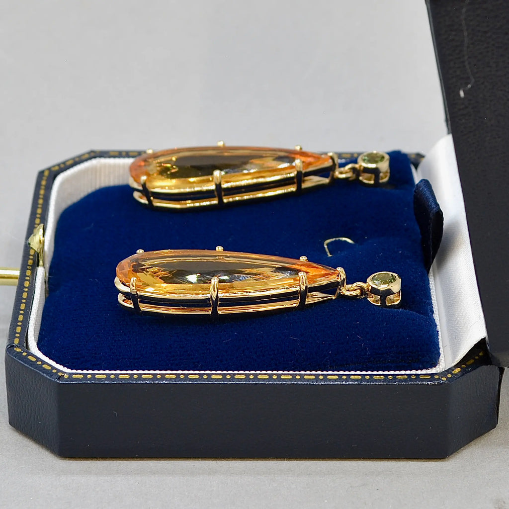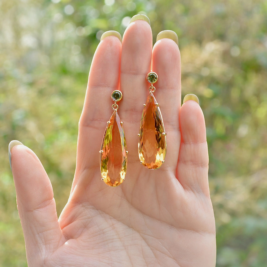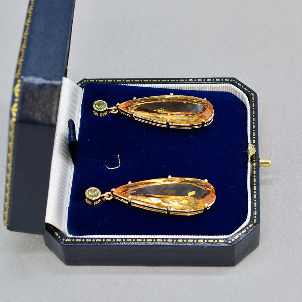 Bold and radiant, these drop earrings make an unforgettable statement. Each features a striking natural citrine, totalling 32.50 carats across the pair, with golden hues that glow with warmth and vibrancy. The elongated pear-shaped citrines are beautifully complemented by round green tourmalines, adding a refreshing contrast of colour.