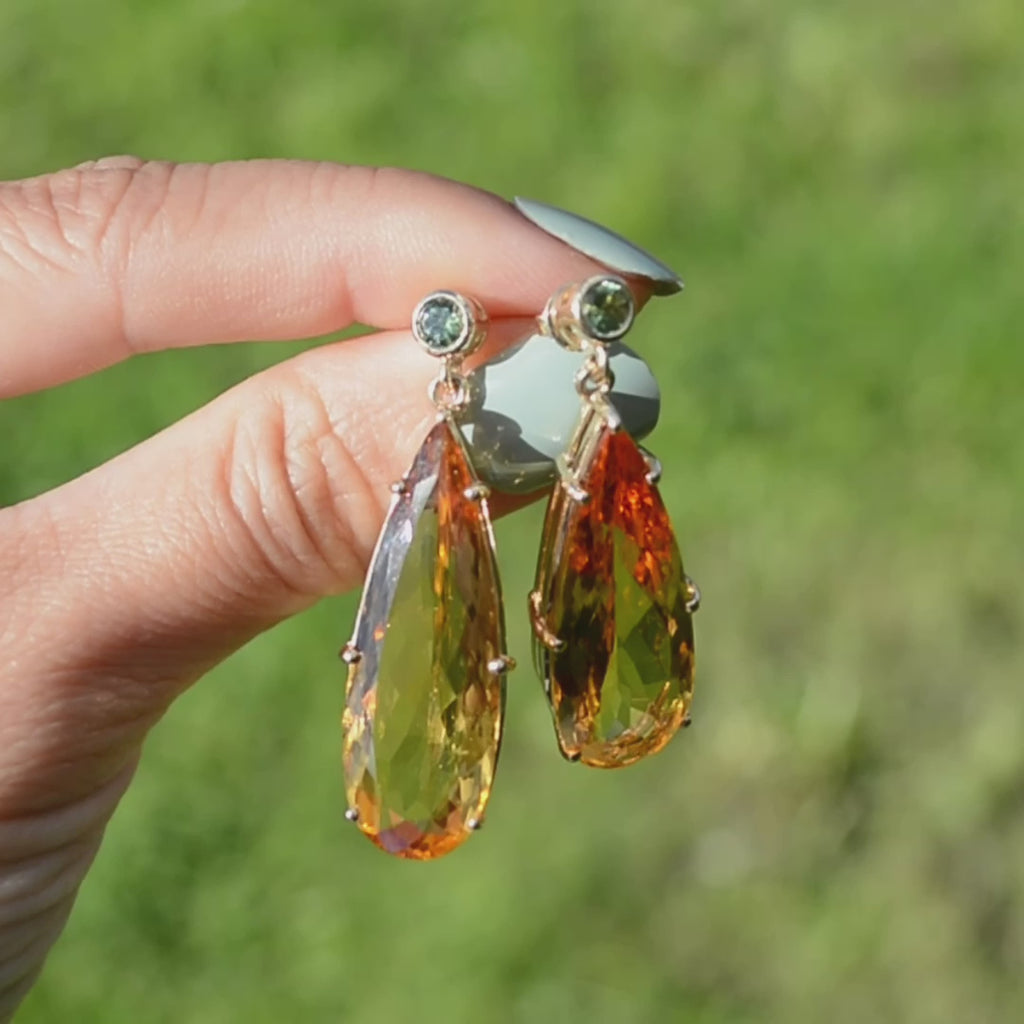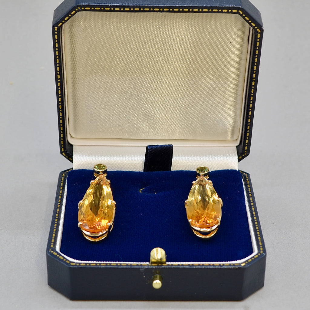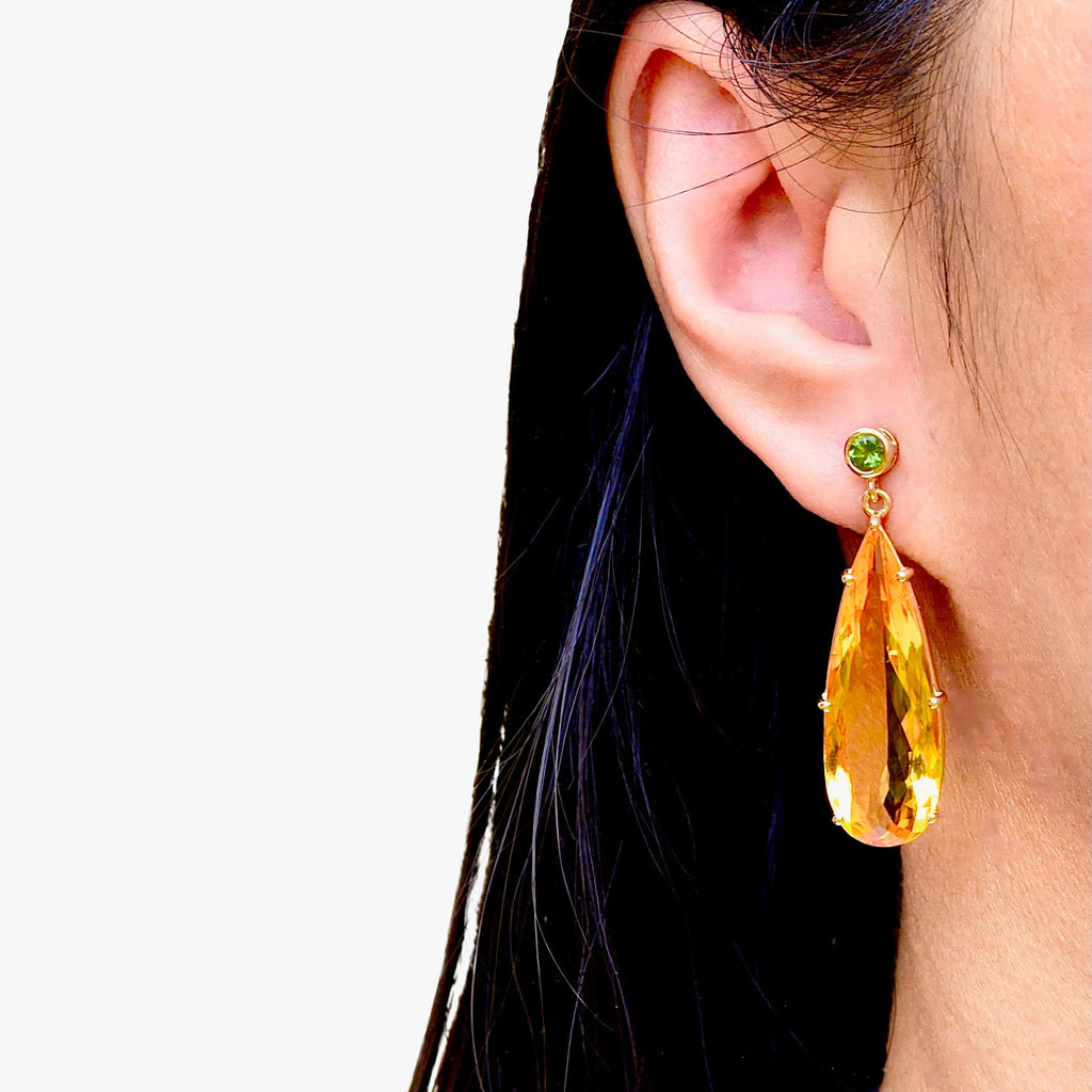 Bold and radiant, these drop earrings make an unforgettable statement. Each features a striking natural citrine, totalling 32.50 carats across the pair, with golden hues that glow with warmth and vibrancy. The elongated pear-shaped citrines are beautifully complemented by round green tourmalines, adding a refreshing contrast of colour.