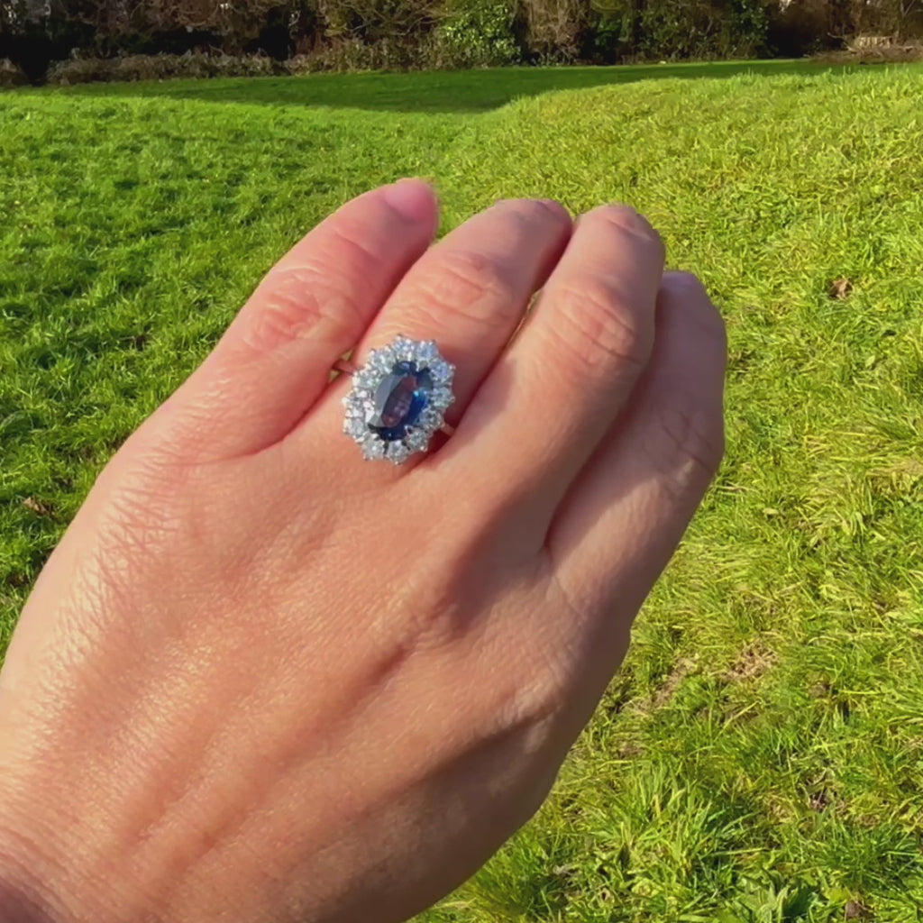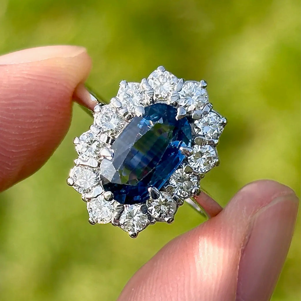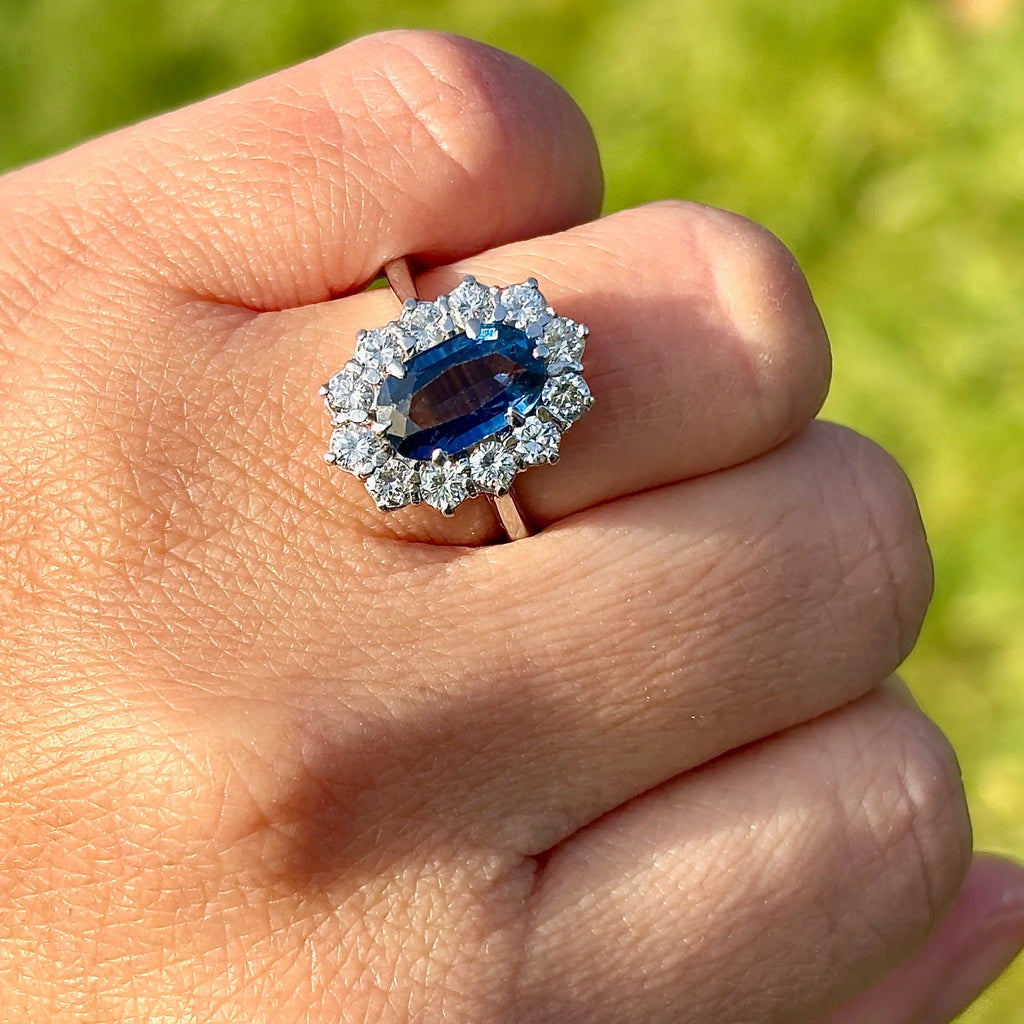 Featuring a natural sapphire confirmed by independent testing with no indications of heating. At its centre sits an elongated oval sapphire of impressive size, glowing in richly saturated velvety blue with subtle natural colour banding across the stone. In softer light it appears calm and composed; in brighter light, flashes of vivid electric blue with gentle teal undertones emerge. Confirmed as unheated by independent gemmological testing, the sapphire carries a rarity and collectability prized by discerning gemstone lovers.