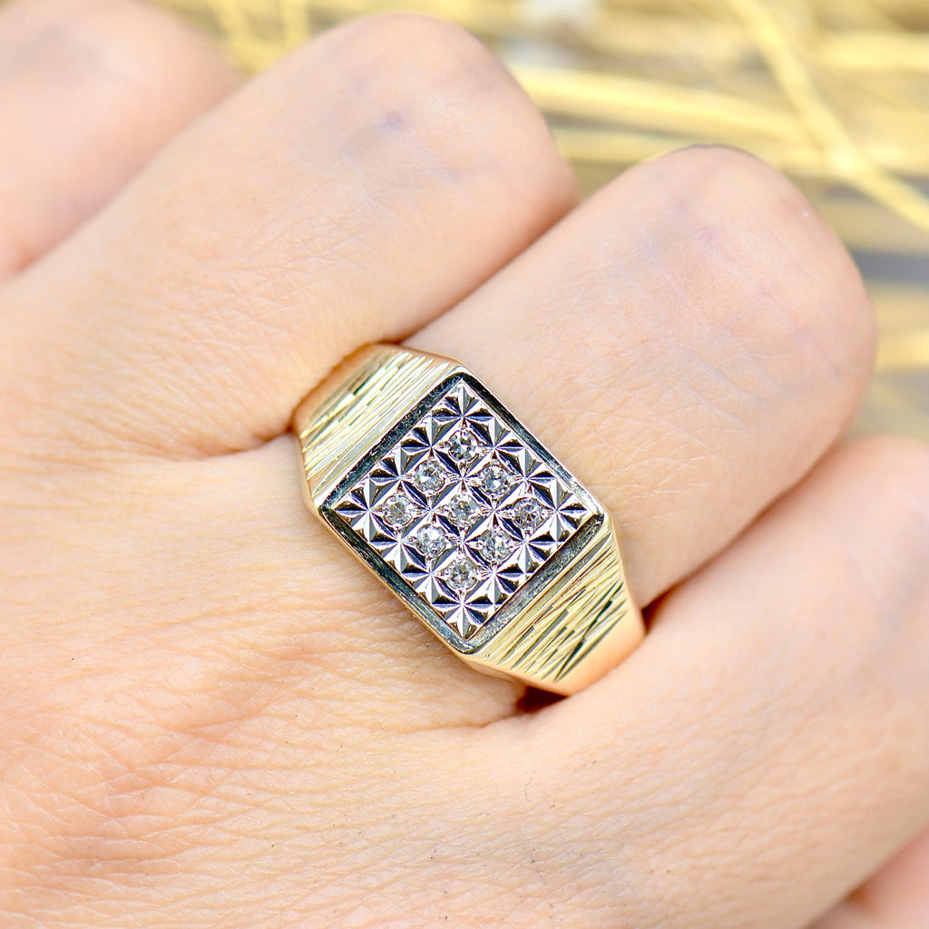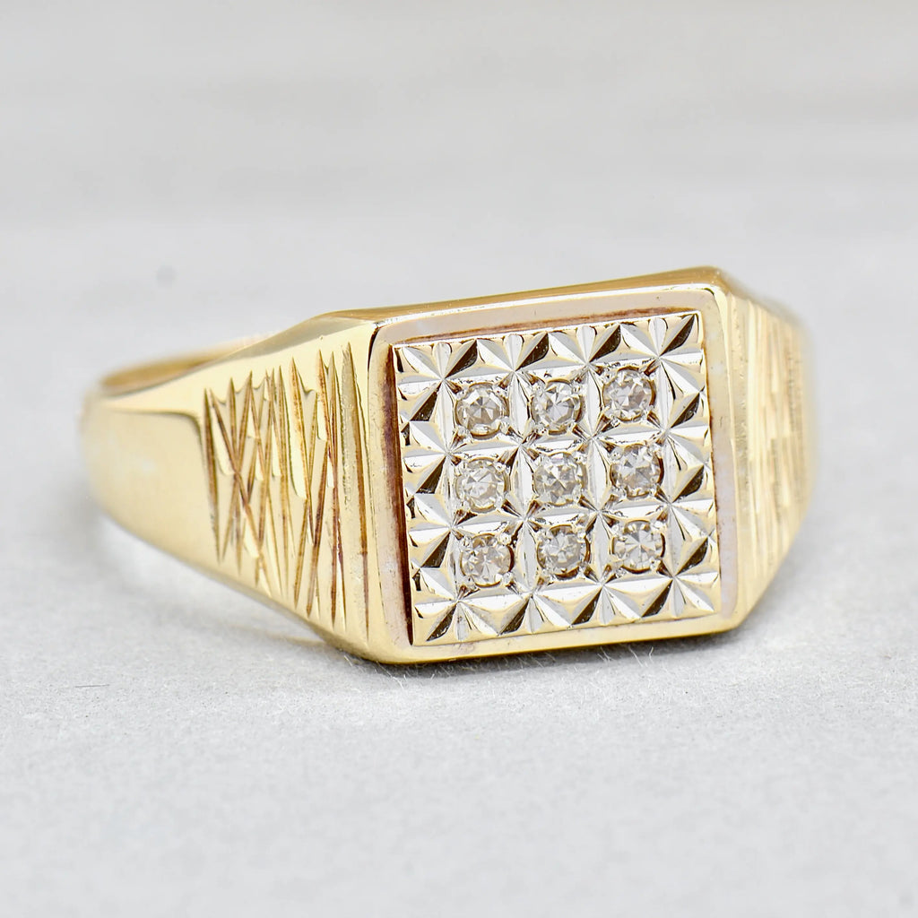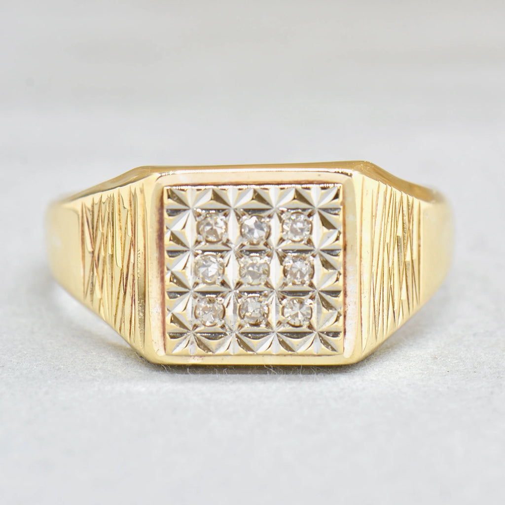 Bold yet refined, this vintage 1980s gentleman’s signet ring is crafted in solid 9ct yellow gold and set with nine natural diamonds in a clean flush-set design. The diamonds are arranged in a classic square formation, while the textured shoulders add character and depth, giving the ring a distinctive vintage edge.