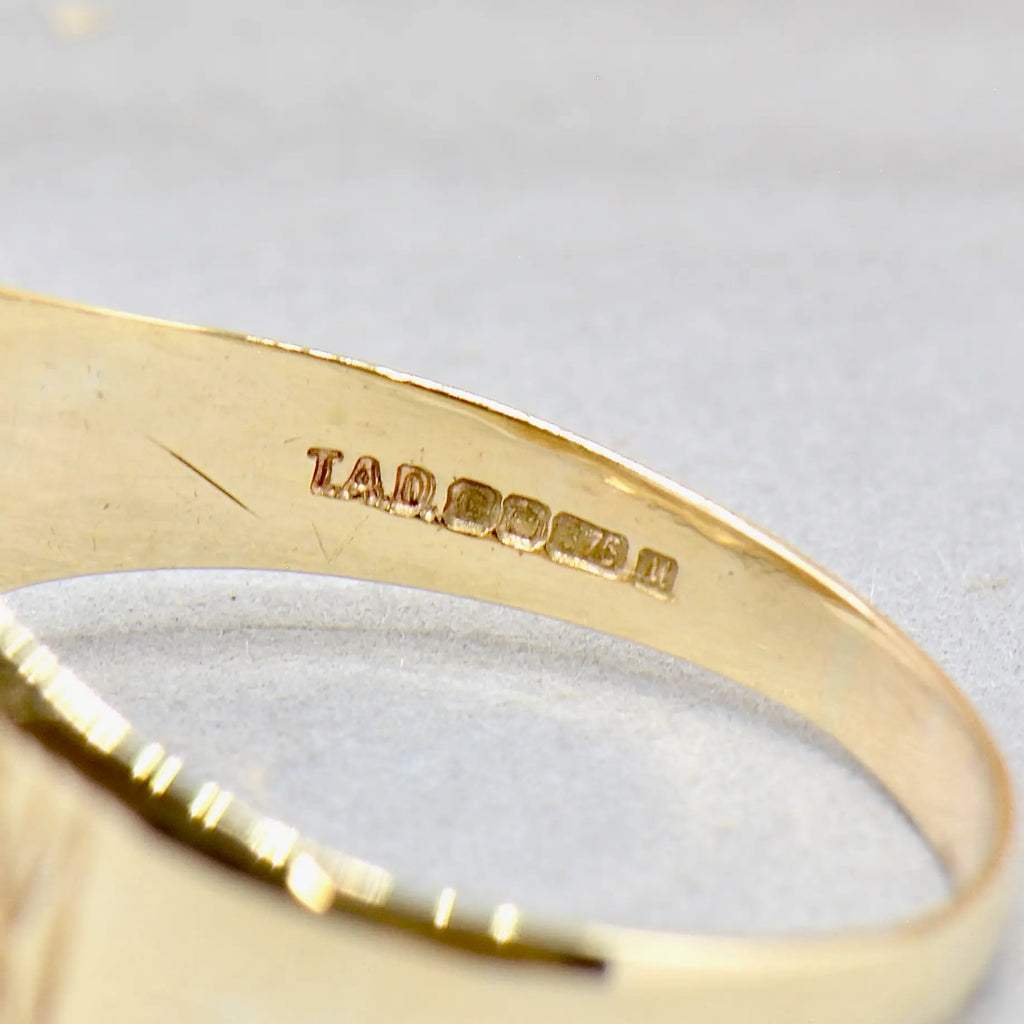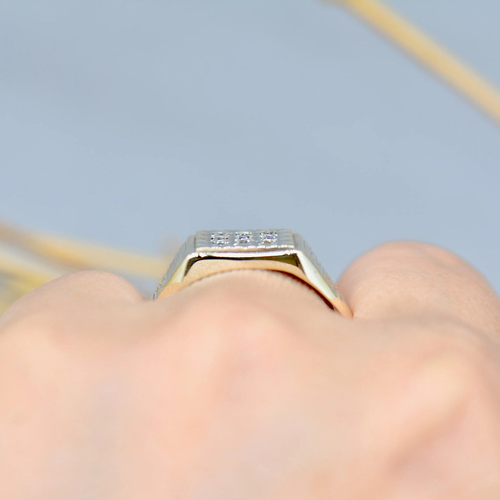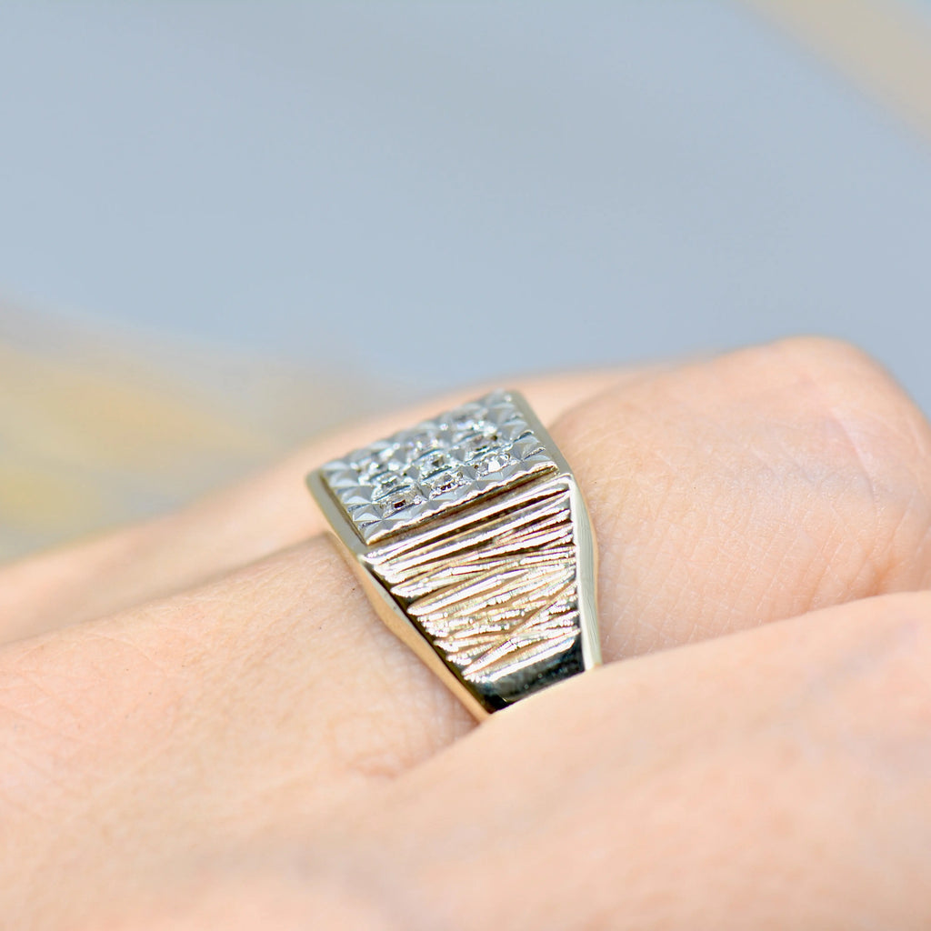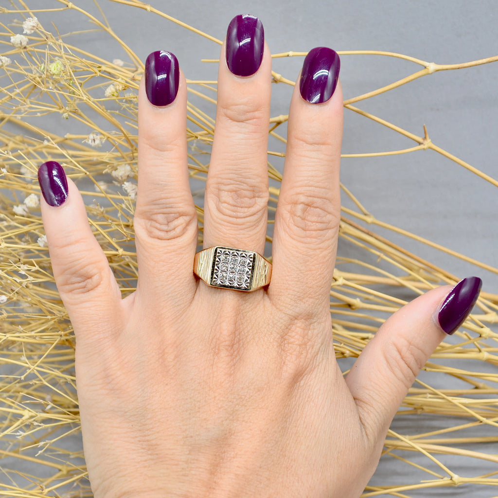 Bold yet refined, this vintage 1980s gentleman’s signet ring is crafted in solid 9ct yellow gold and set with nine natural diamonds in a clean flush-set design. The diamonds are arranged in a classic square formation, while the textured shoulders add character and depth, giving the ring a distinctive vintage edge.