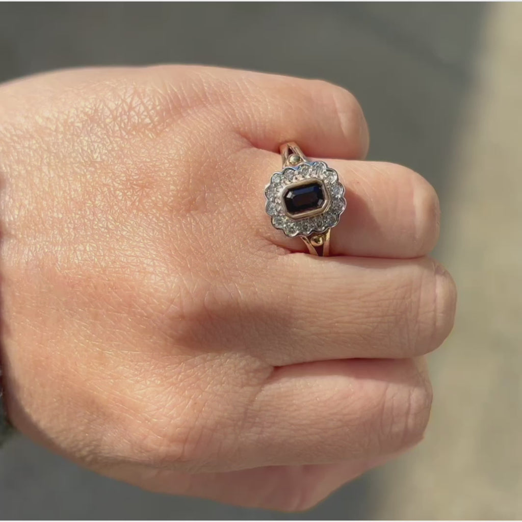 这款 9K 黄金群镶戒指是永恒而优雅的复古魅力之作,镶嵌着一颗美丽的深蓝色天然蓝宝石。蓝宝石采用经典的祖母绿式切工,并以安全的包镶工艺镶嵌,呈现出迷人的墨蓝色调,在光线较暗时几乎呈黑色。