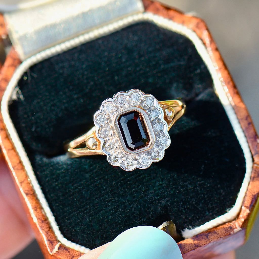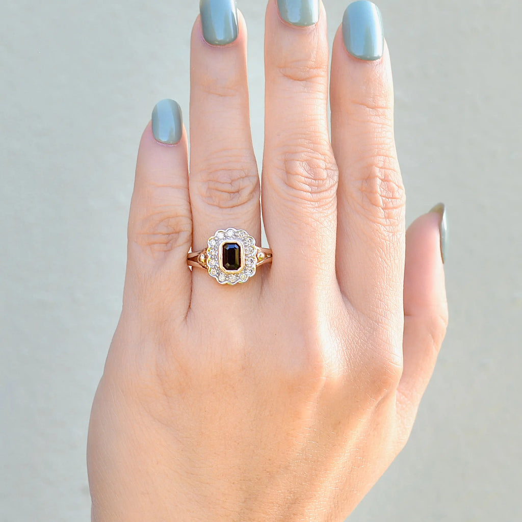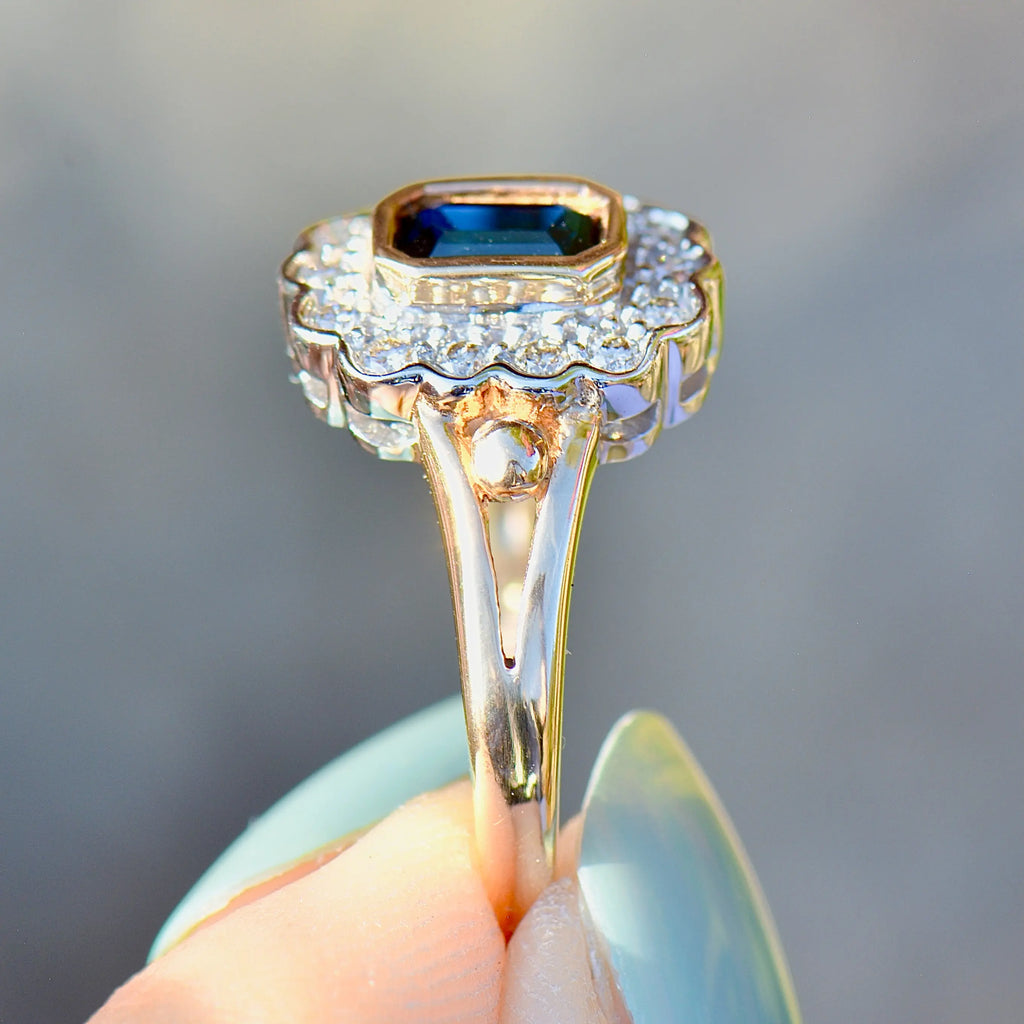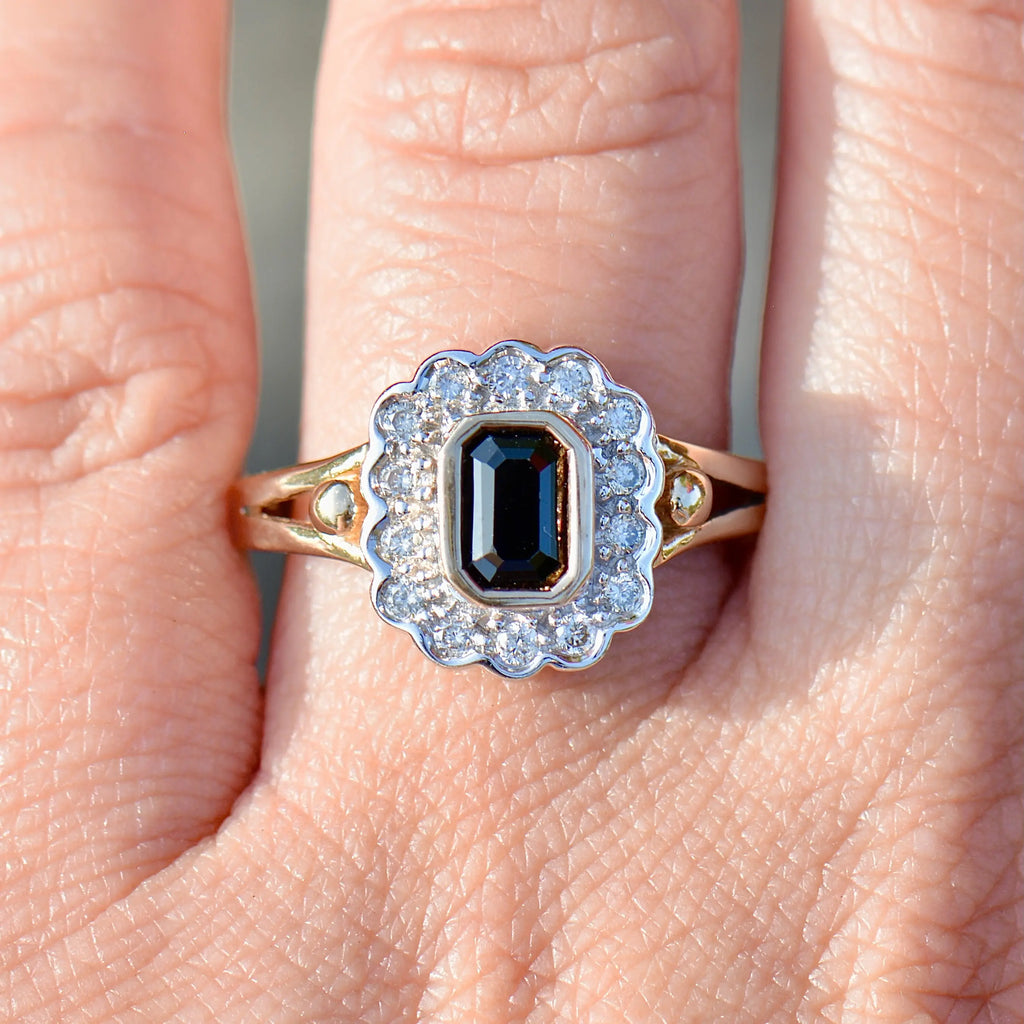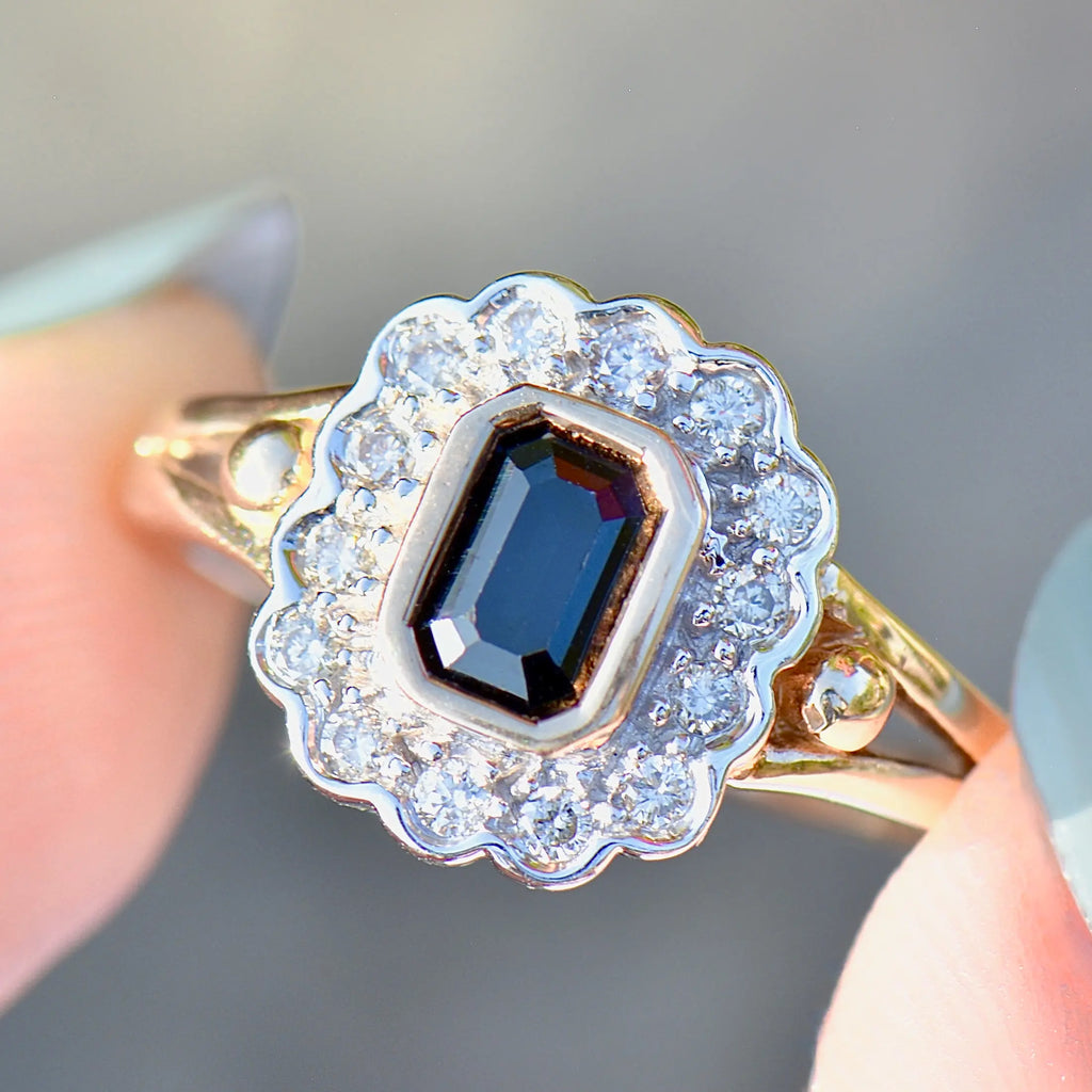 A timeless and elegant piece of vintage charm, this 9ct yellow gold cluster ring features a beautifully deep blue natural sapphire. Faceted in a classic emerald cut and securely bezel set, the sapphire displays a captivating inky blue tone that appears almost black in lower lighting.